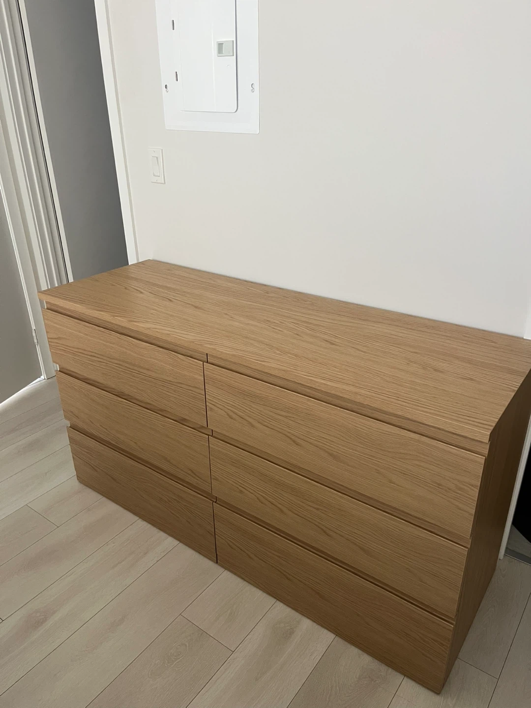 This is a six-drawer dresser with a light wood finish. It offers ample storage space. It's a nice addition to any bedroom or living area.