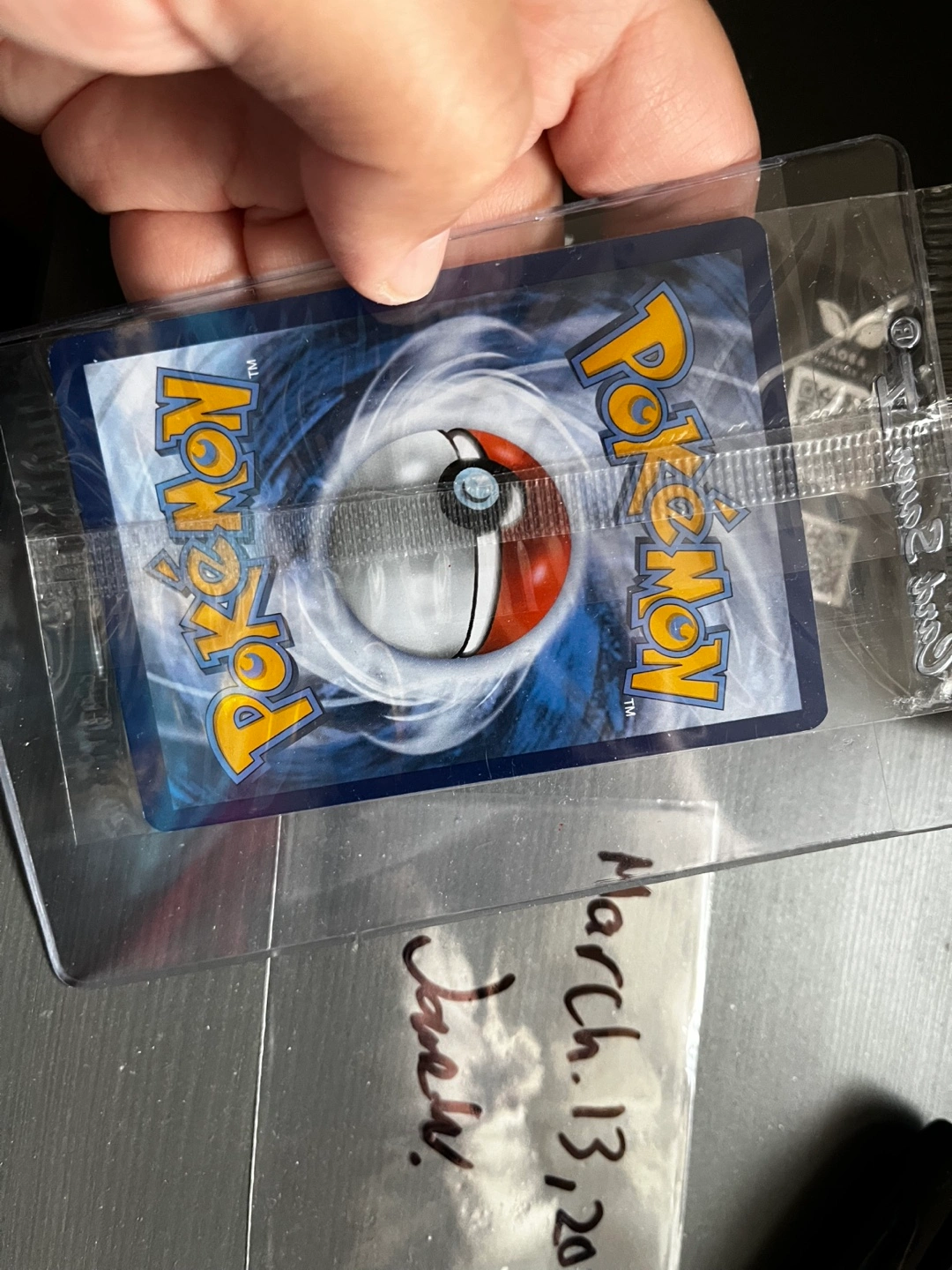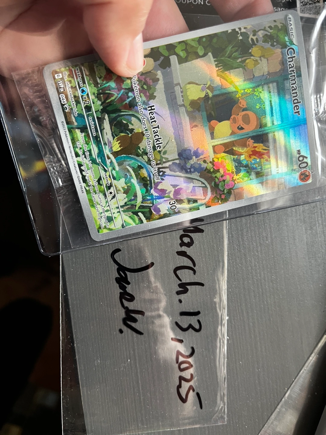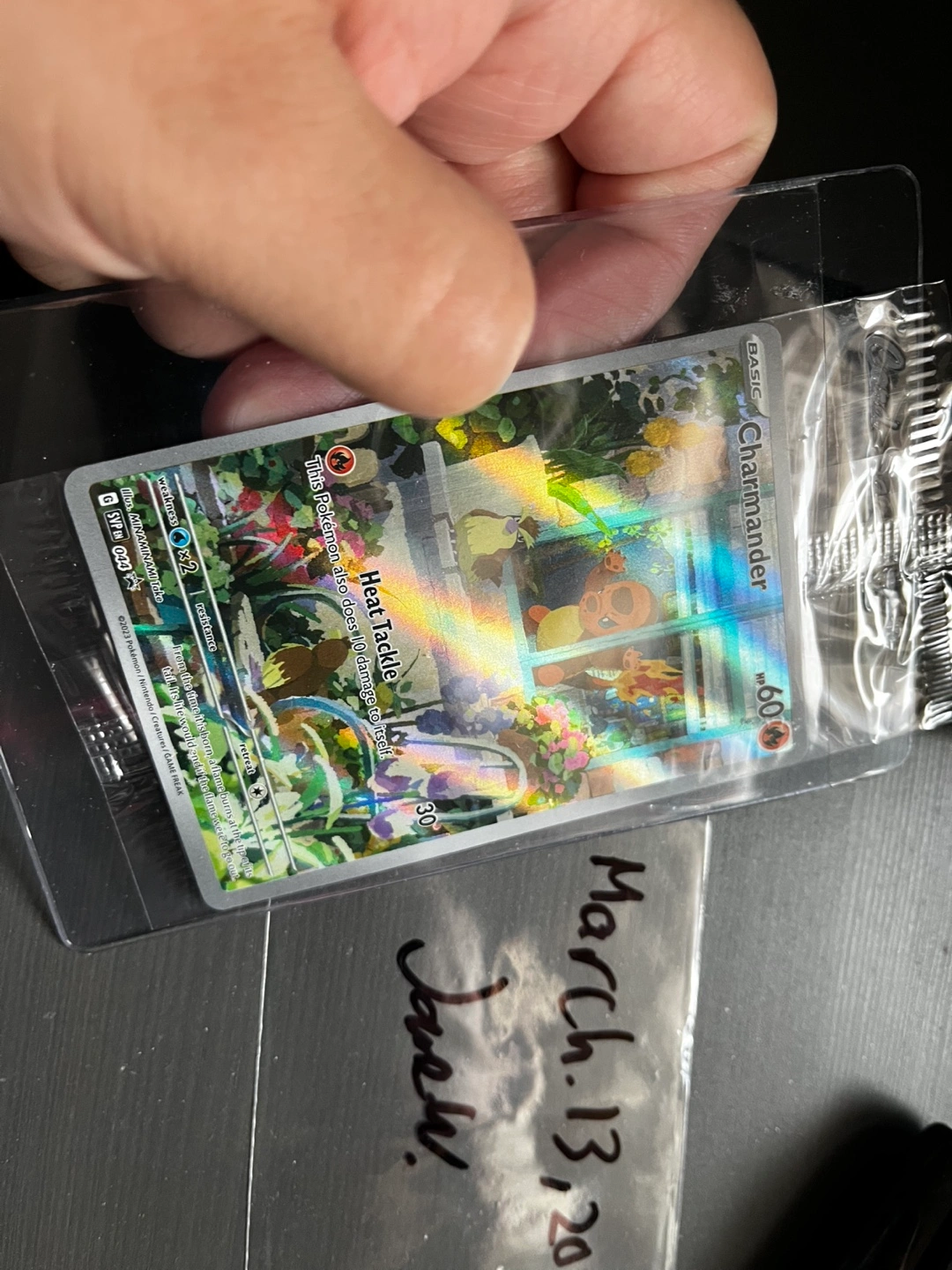 Two Pokemon cards: sealed Charmander and masterball Pikachu. Both in protective sleeves. Excellent condition.