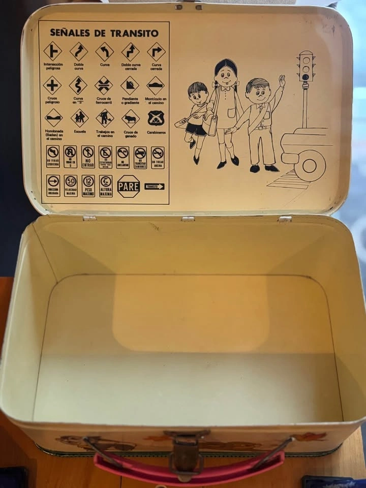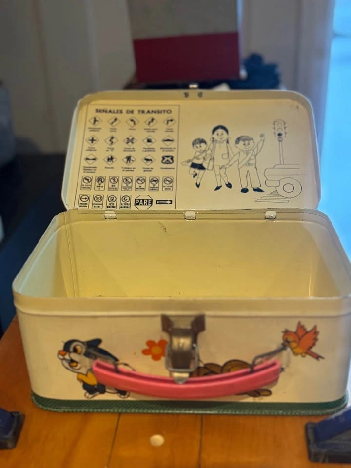 Vintage metal lunchbox features Disney's Bambi, Thumper, and Flower on the front with a pink handle. The inside lid has cool traffic signs and kids graphics. The inside is yellow. Great for display or collecting!