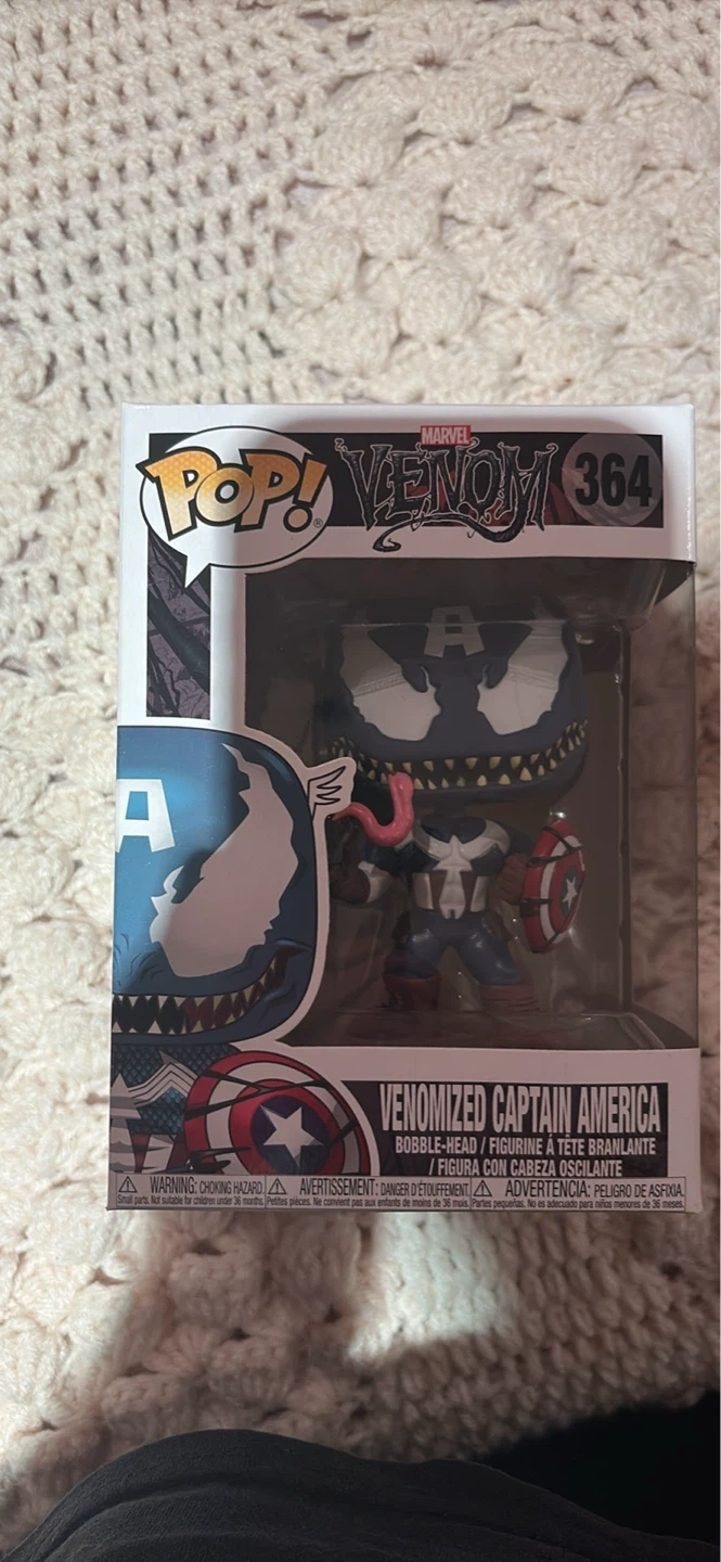 This is a Funko Pop! Marvel Venomized Captain America bobble-head figurine, number 364. It comes in its original box. It's a cool collectible for any Marvel fan!