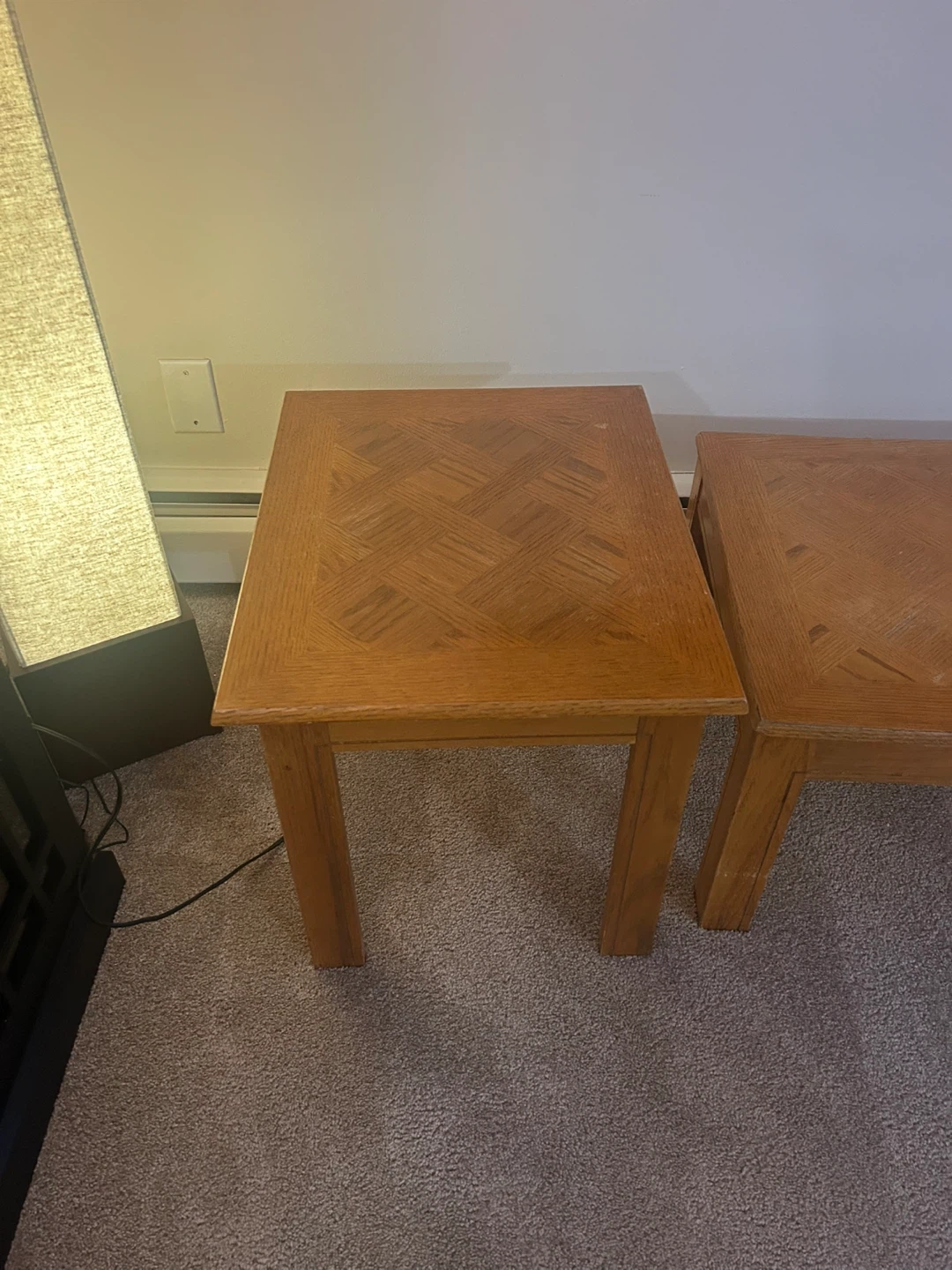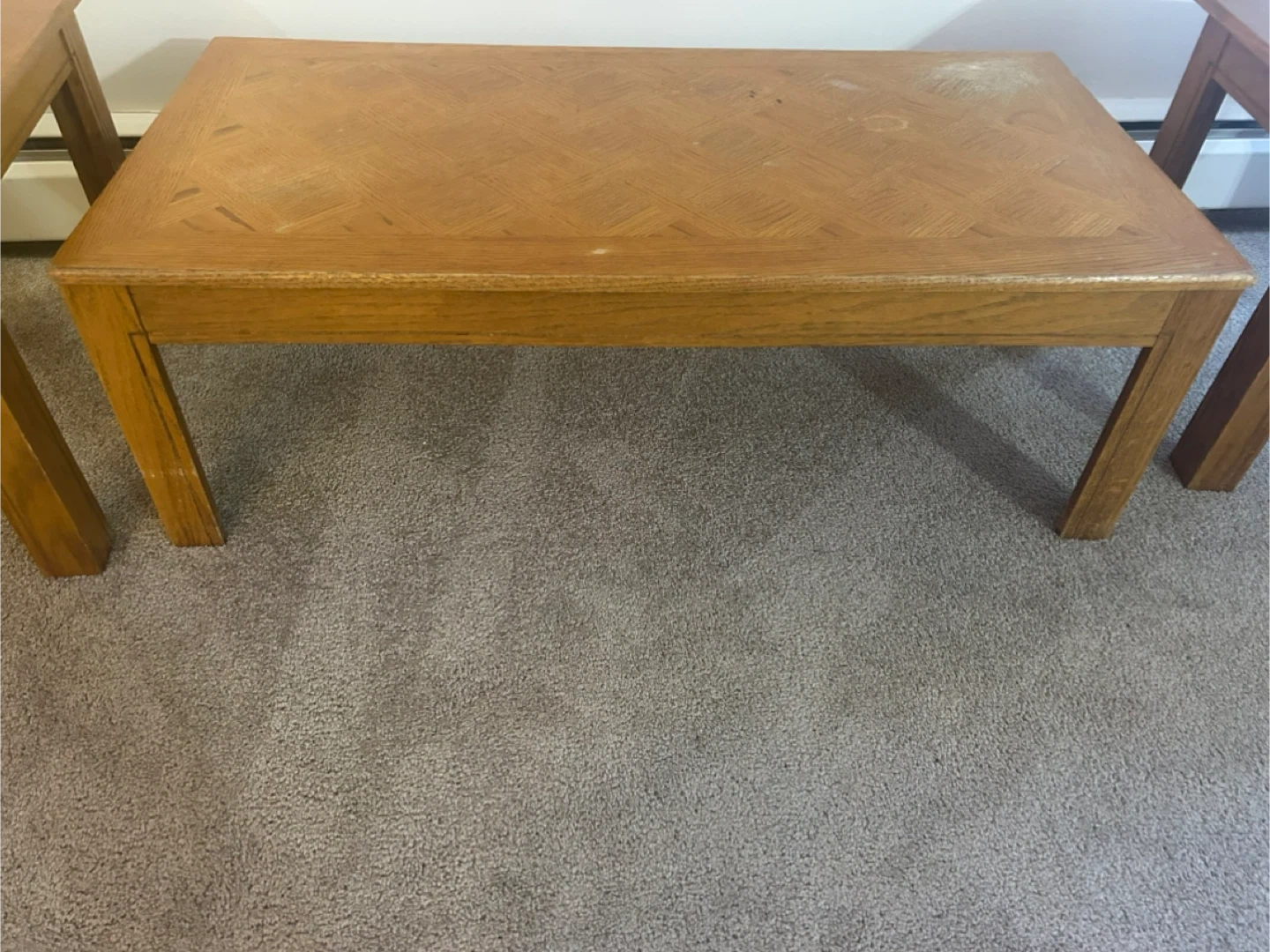 Selling a set of three wooden tables: a coffee table and two end tables. They're sturdy and have a nice wood grain pattern on top. Perfect for a living room or family room setup!