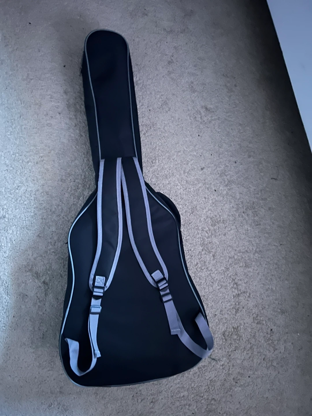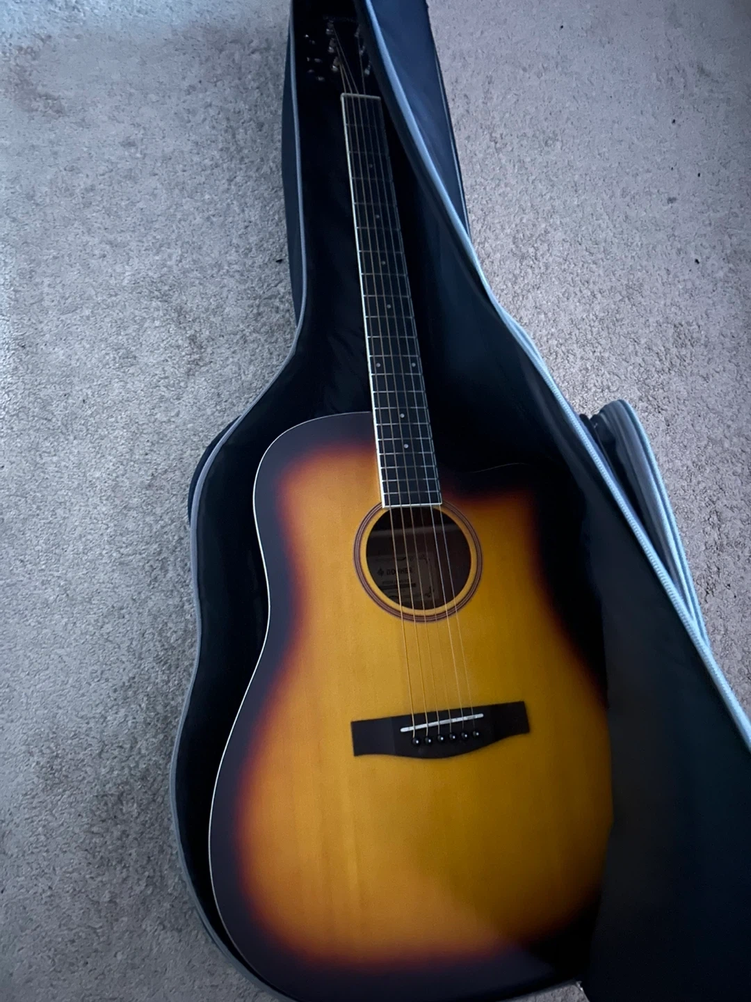 Donner acoustic guitar in a sunburst finish. It comes with a padded gig bag for protection and transport. This guitar is suitable for beginners or intermediate players looking for a new instrument.