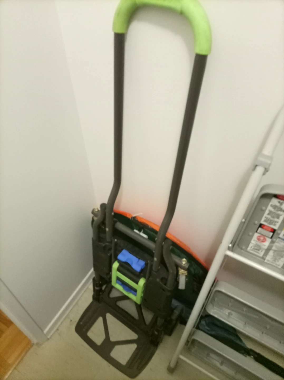 A handy folding hand truck dolly for moving items. It features green comfort grips and a sturdy base. This dolly folds flat for easy storage when not in use.