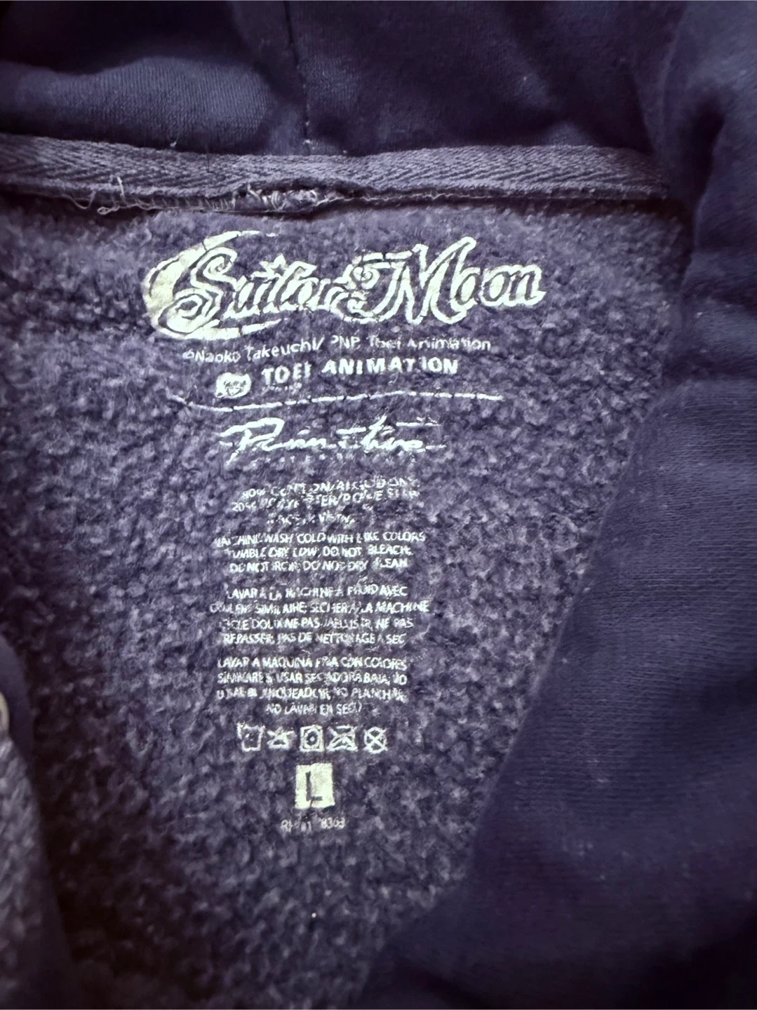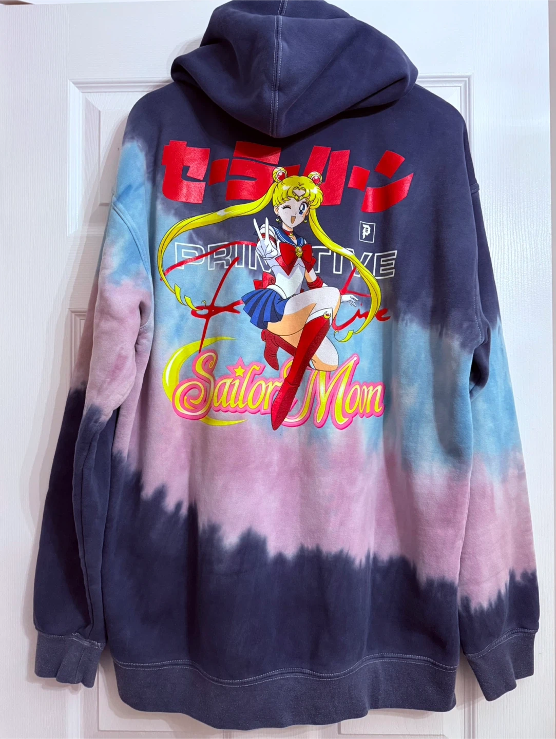 This Primitive hoodie features a tie-dye pattern with Sailor Moon graphics on the back. It's a size large and made of a comfortable cotton blend. A great piece for fans of the anime!