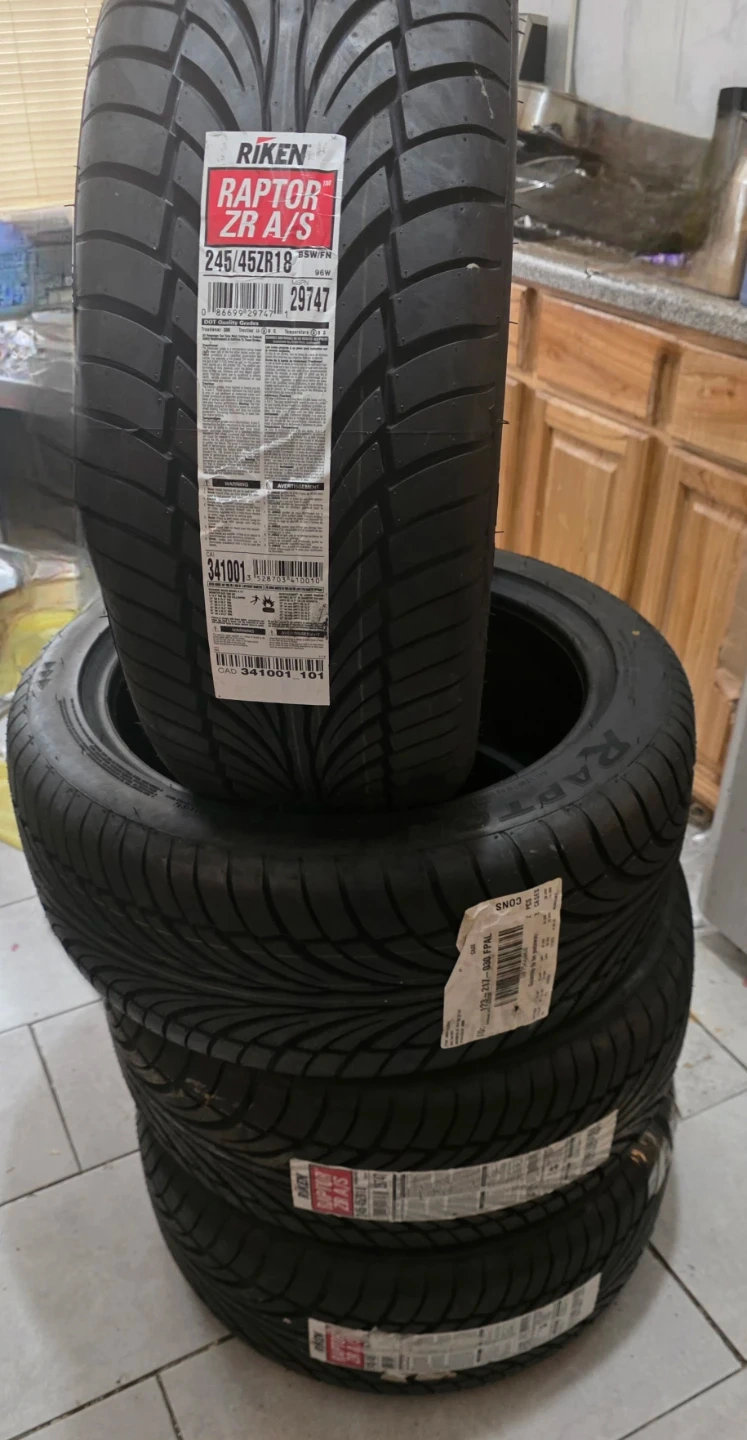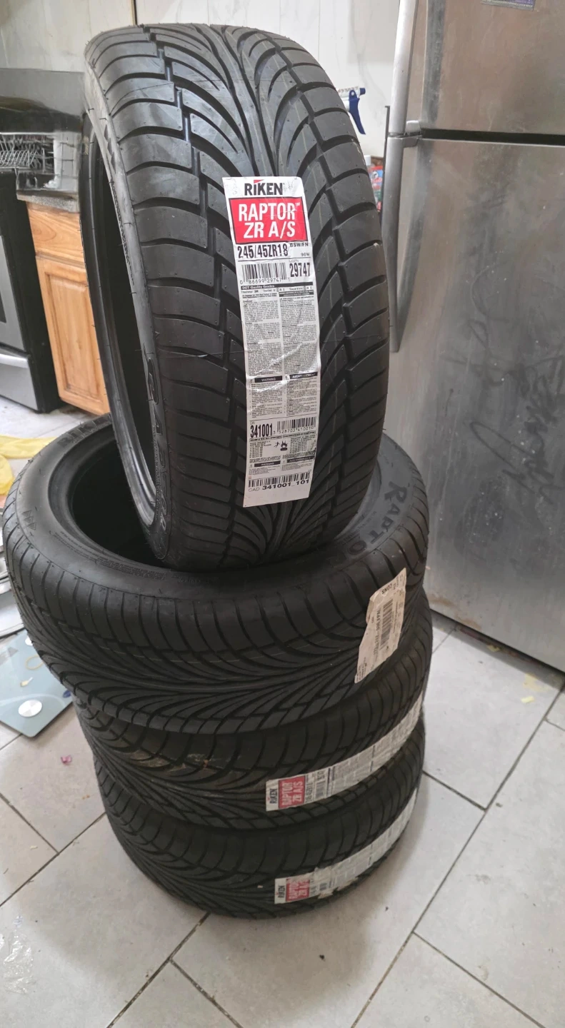 This is a set of four RIKEN Raptor ZR A/S tires. The tire size is 245/45ZR18. They're all in new condition with tags attached.
