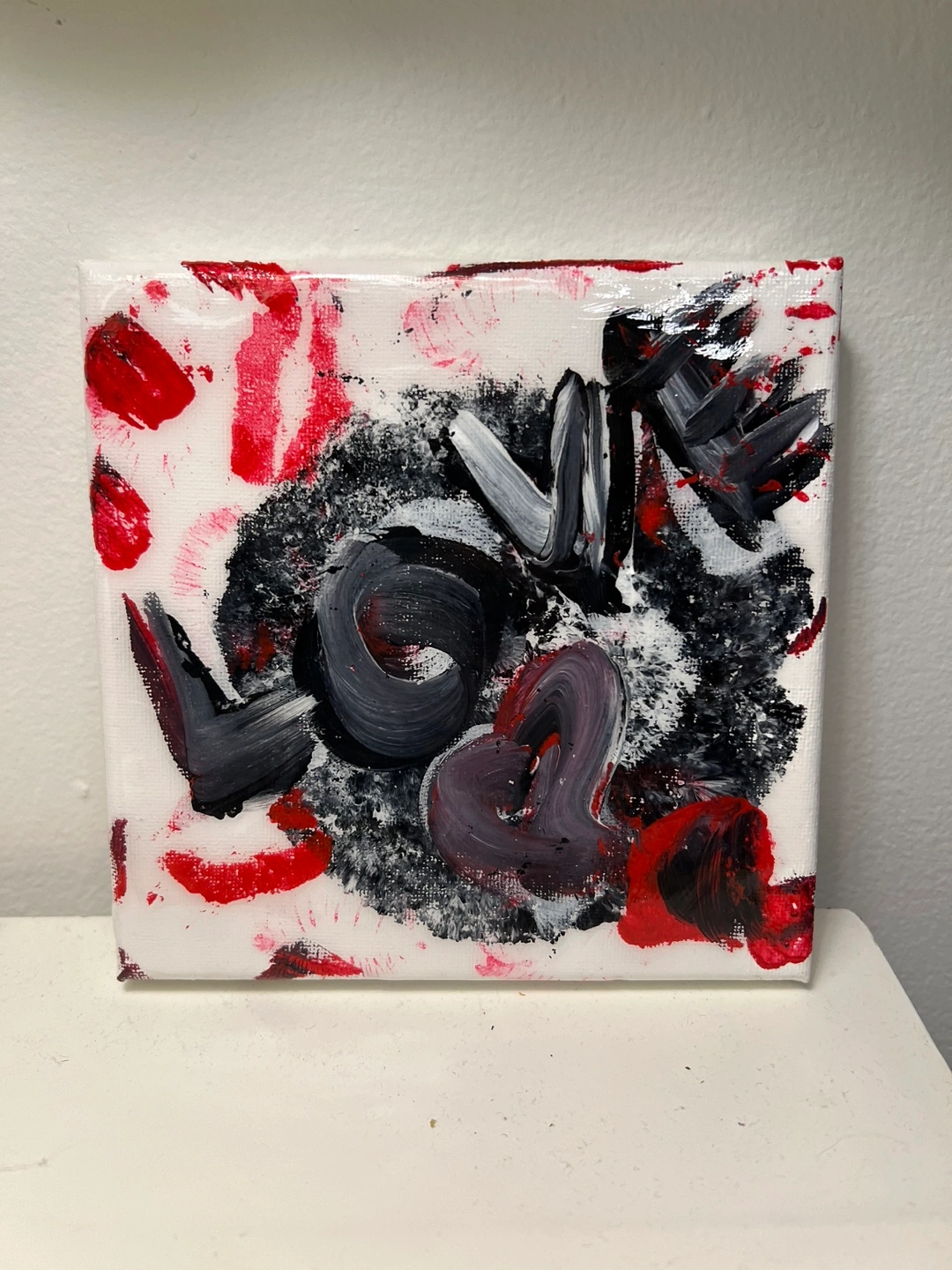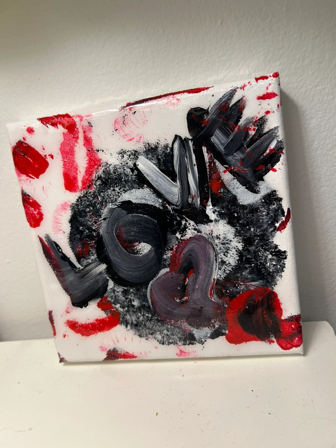 Small canvas painting with red and black paint. The word 'Love' is written on the canvas.