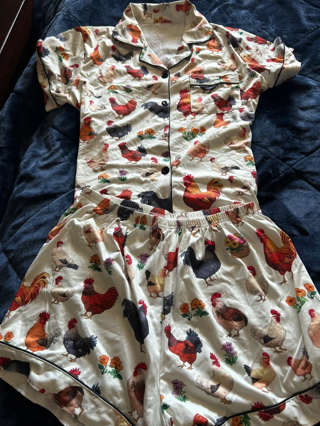 Cute chicken print pajama set. Made with 95% polyester and 5% elastane. Machine wash cool, hang to dry.