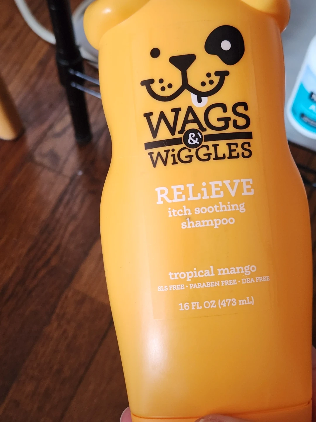 I'm selling a bottle of Wags & Wiggles Relieve Itch Soothing Shampoo! It's a tropical mango scented shampoo that's SLS, paraben, and DEA free. The bottle contains 16 fl oz (473 mL).