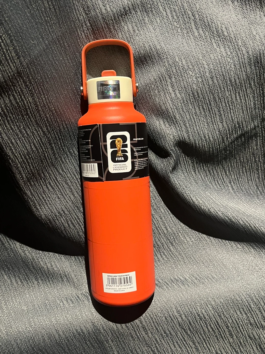 This is a FIFA World Cup 26 performance water bottle. It's orange and has a 700ml capacity. Includes a convenient carrying handle.