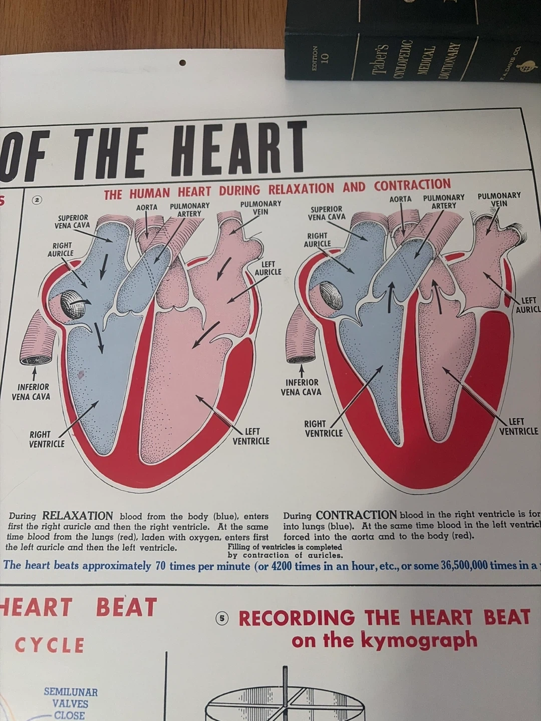 This educational poster illustrates the human heart during relaxation and contraction. It also details the cardiac cycle and the electrocardiogram. The poster covers the work of the heart and heart sounds. Published by The Sargent-Welch Scientific Company.