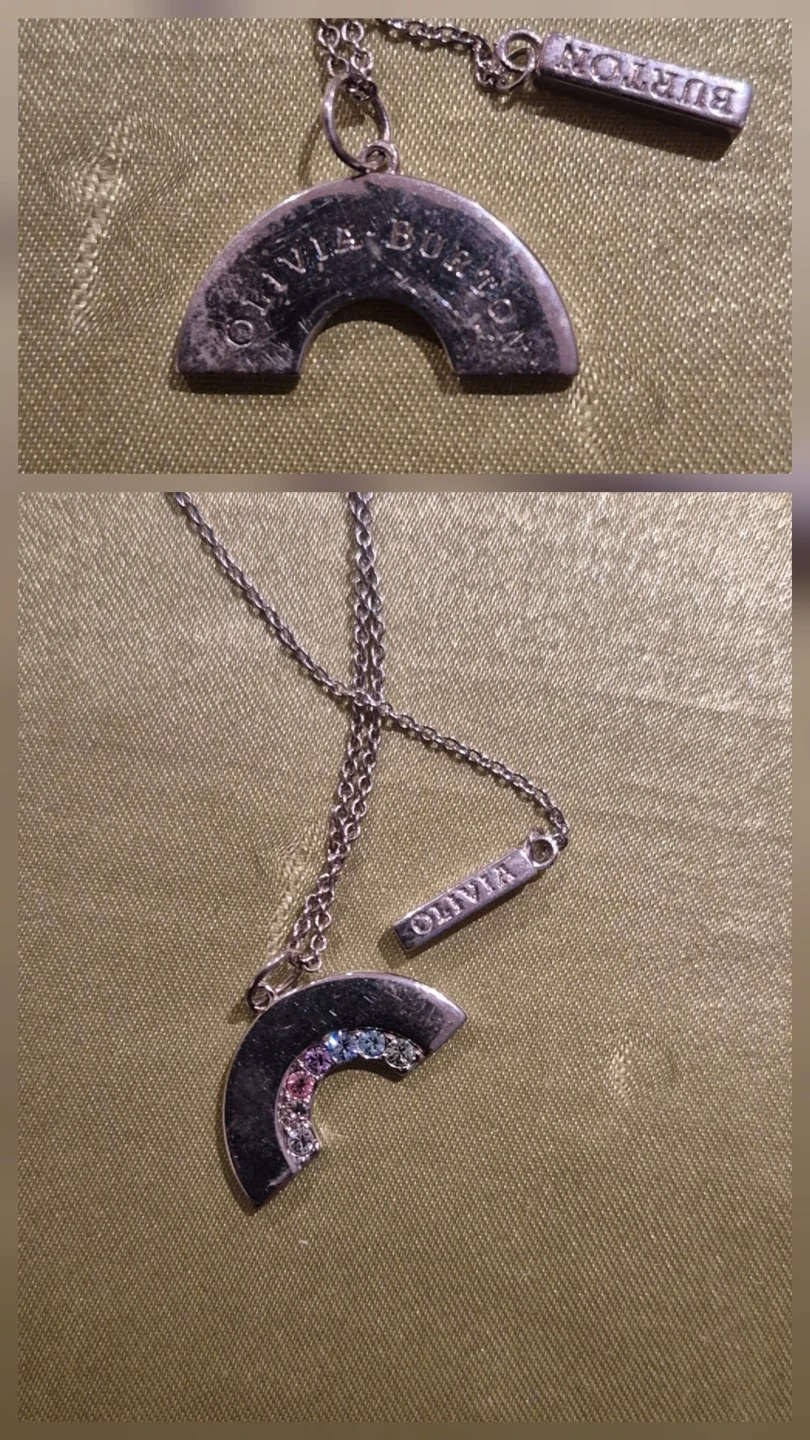 Olivia Burton necklace featuring a silver-tone rainbow charm. The charm is accented with colourful small crystals. Includes a delicate chain with a branded bar tag.