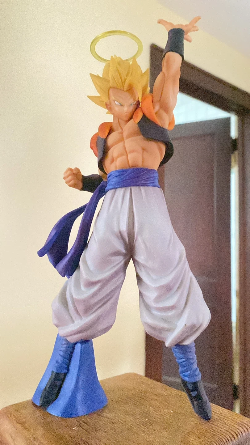 This is a Gogeta figure from Dragon Ball Z. It's made of plastic and stands on a base. The figure has a halo accessory.