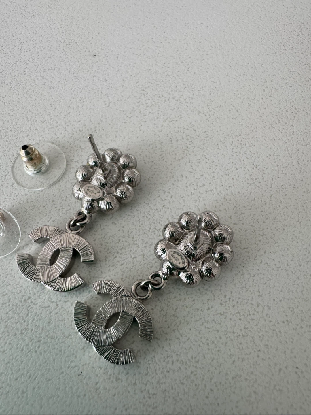 These are beautiful Chanel earrings featuring a floral design with pearls and crystals. They have the classic Chanel logo dangling below. Perfect for adding a touch of elegance to any outfit!
