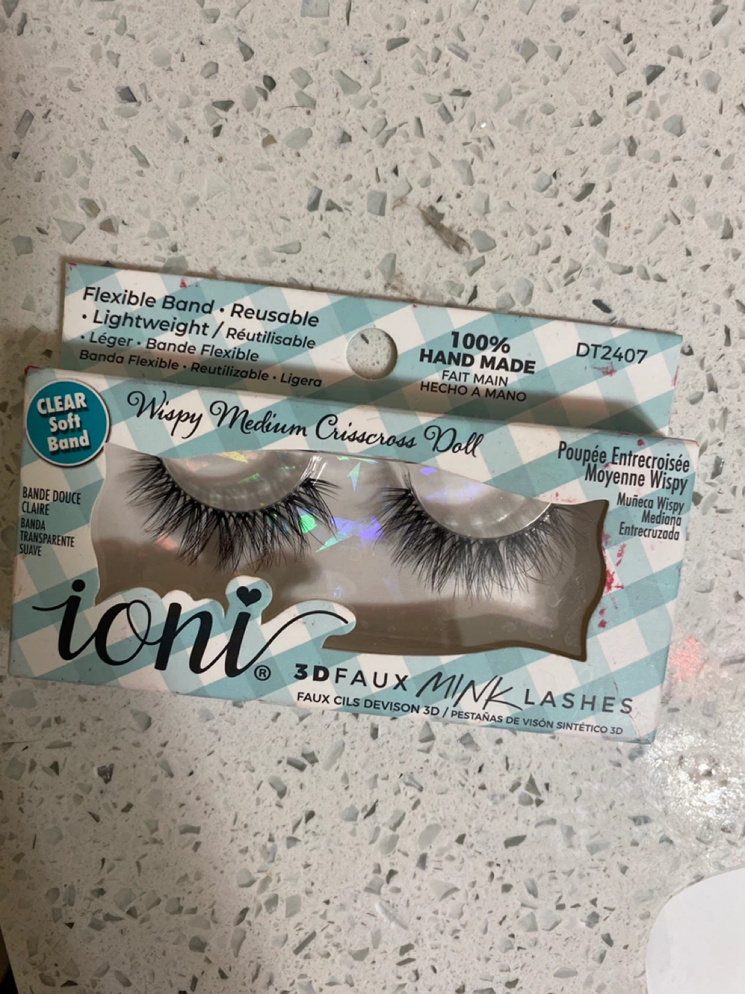 These are iOni 3D Faux Mink Lashes in the Wispy Medium Crisscross Doll style. They're 100% hand-made with a flexible, clear soft band that's reusable and lightweight. These lashes are designed for a natural, yet full look.