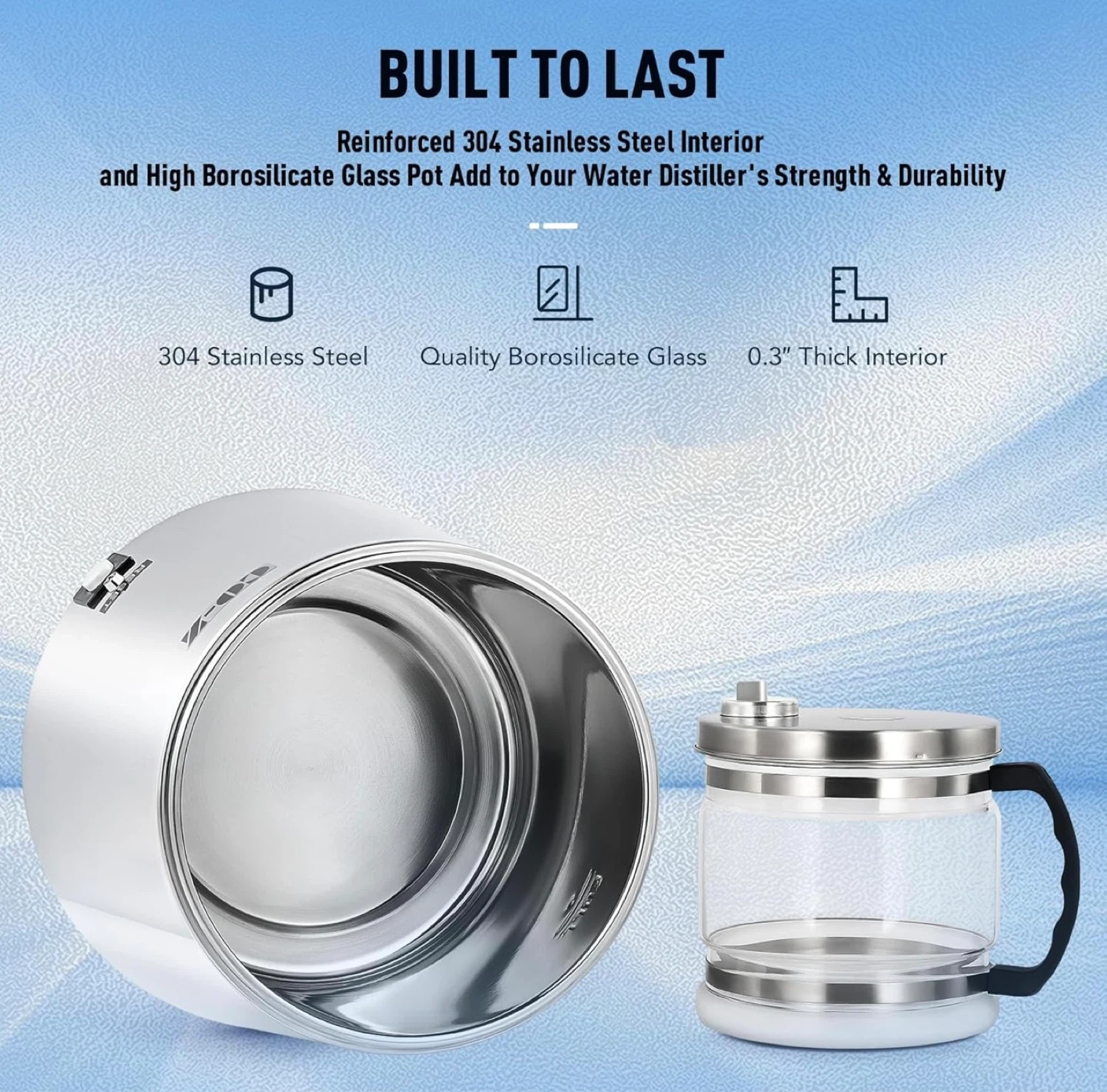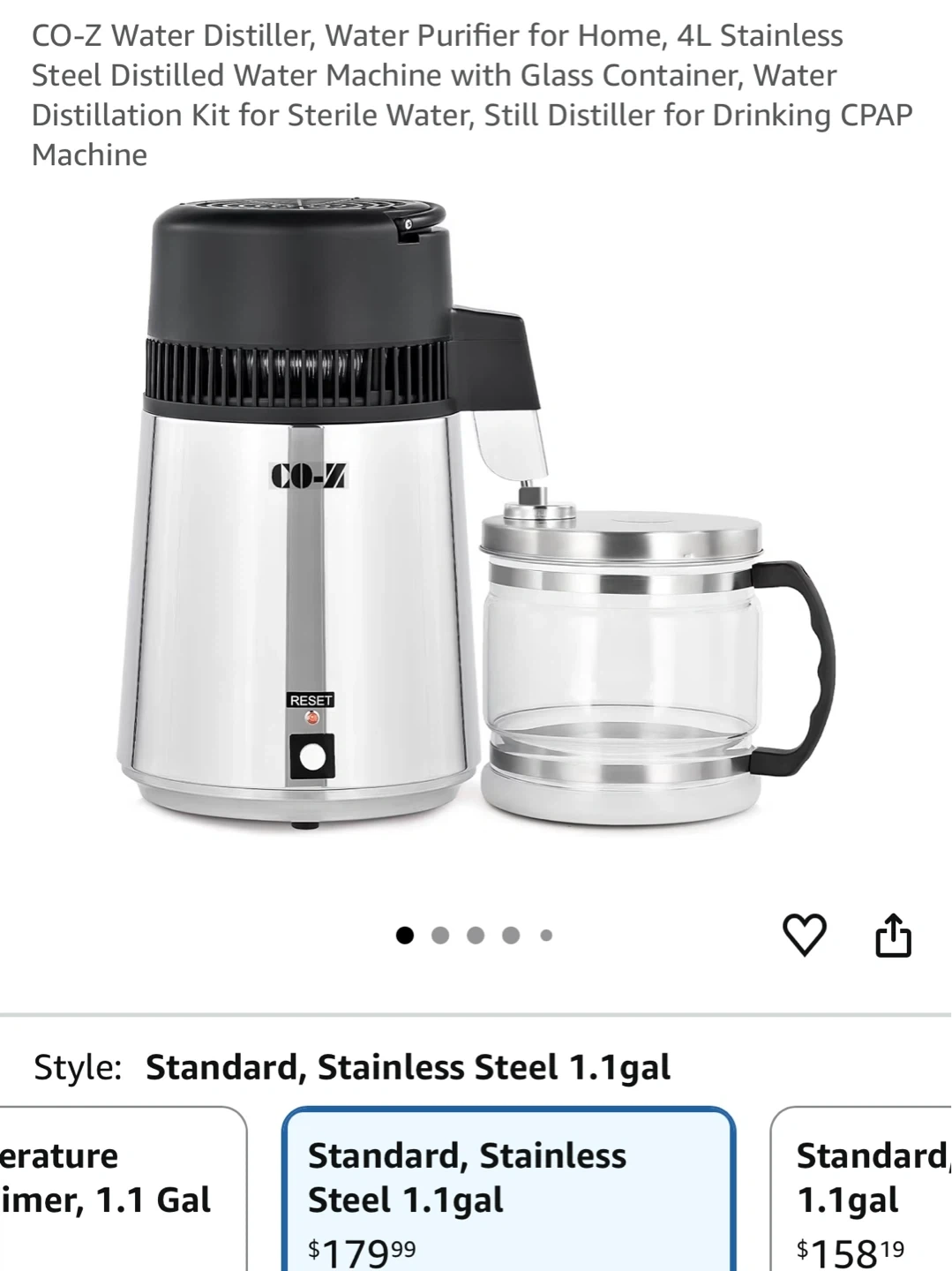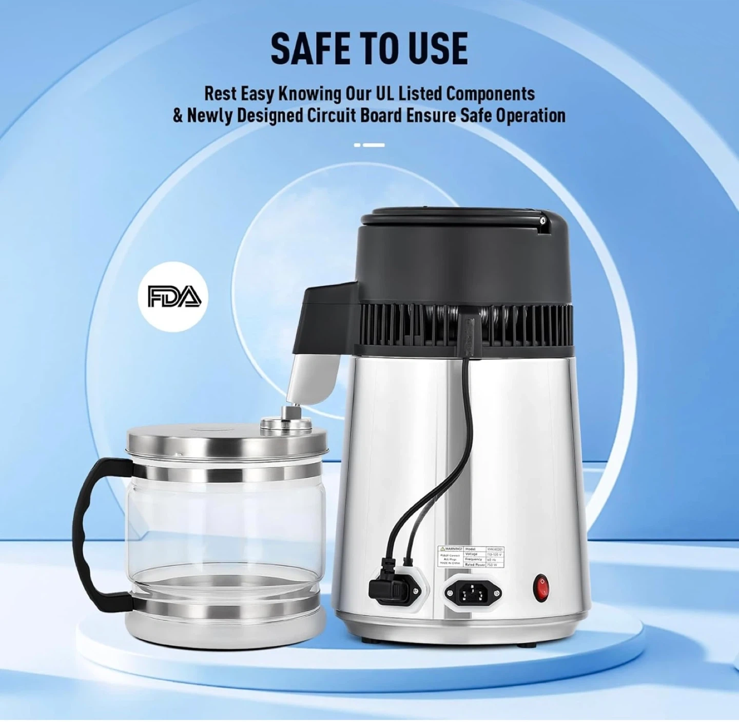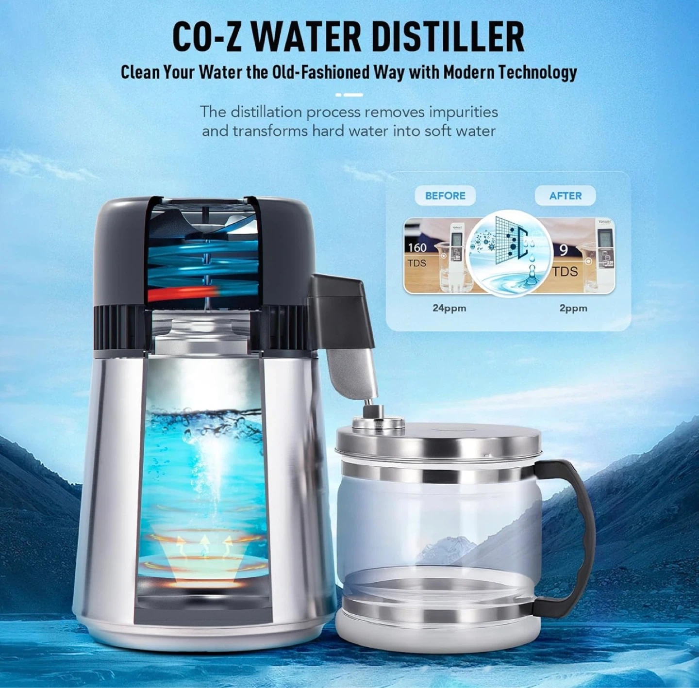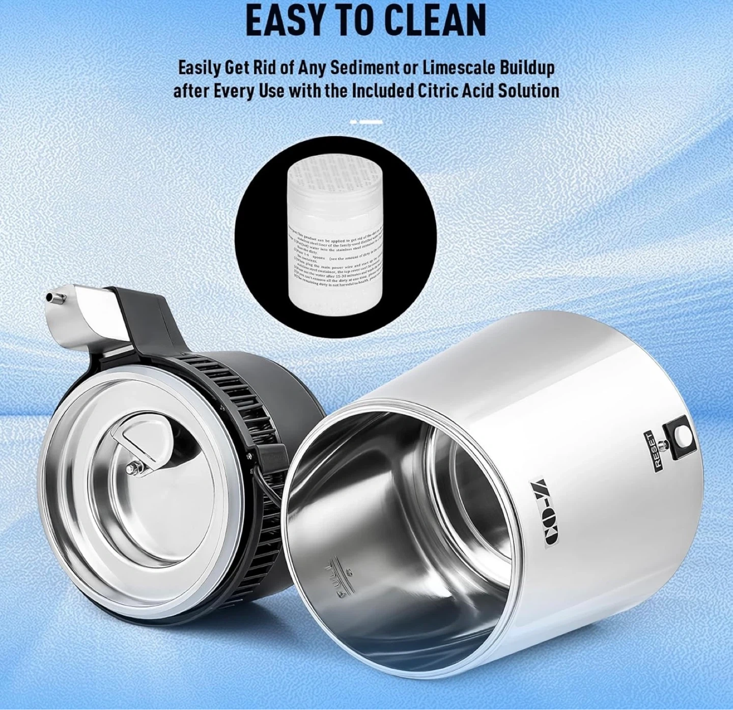 This CO-Z water distiller has a 4L capacity with a stainless steel interior and a high borosilicate glass pot. It's designed for home use to purify water. It includes a citric acid solution for easy cleaning.