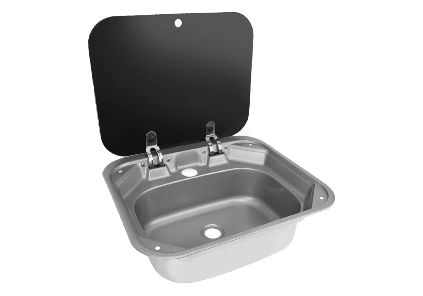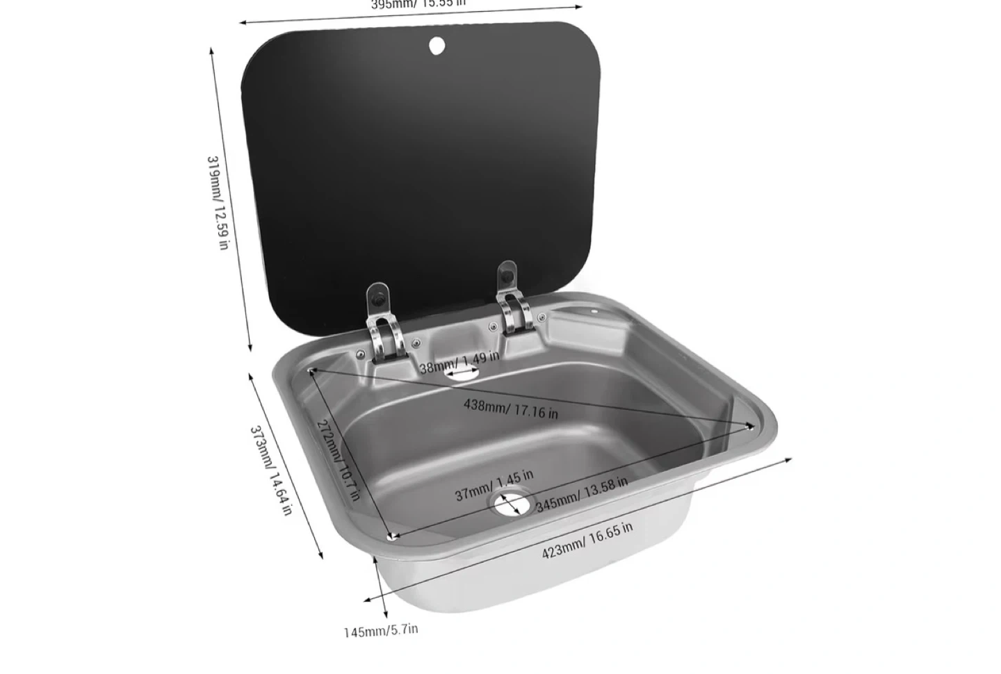 This is a stainless steel RV sink. It's made from durable stainless steel and includes a black cover. The sink is 373mm high, with the bowl measuring 438mm by 345mm. It's great for use in RVs or campers!