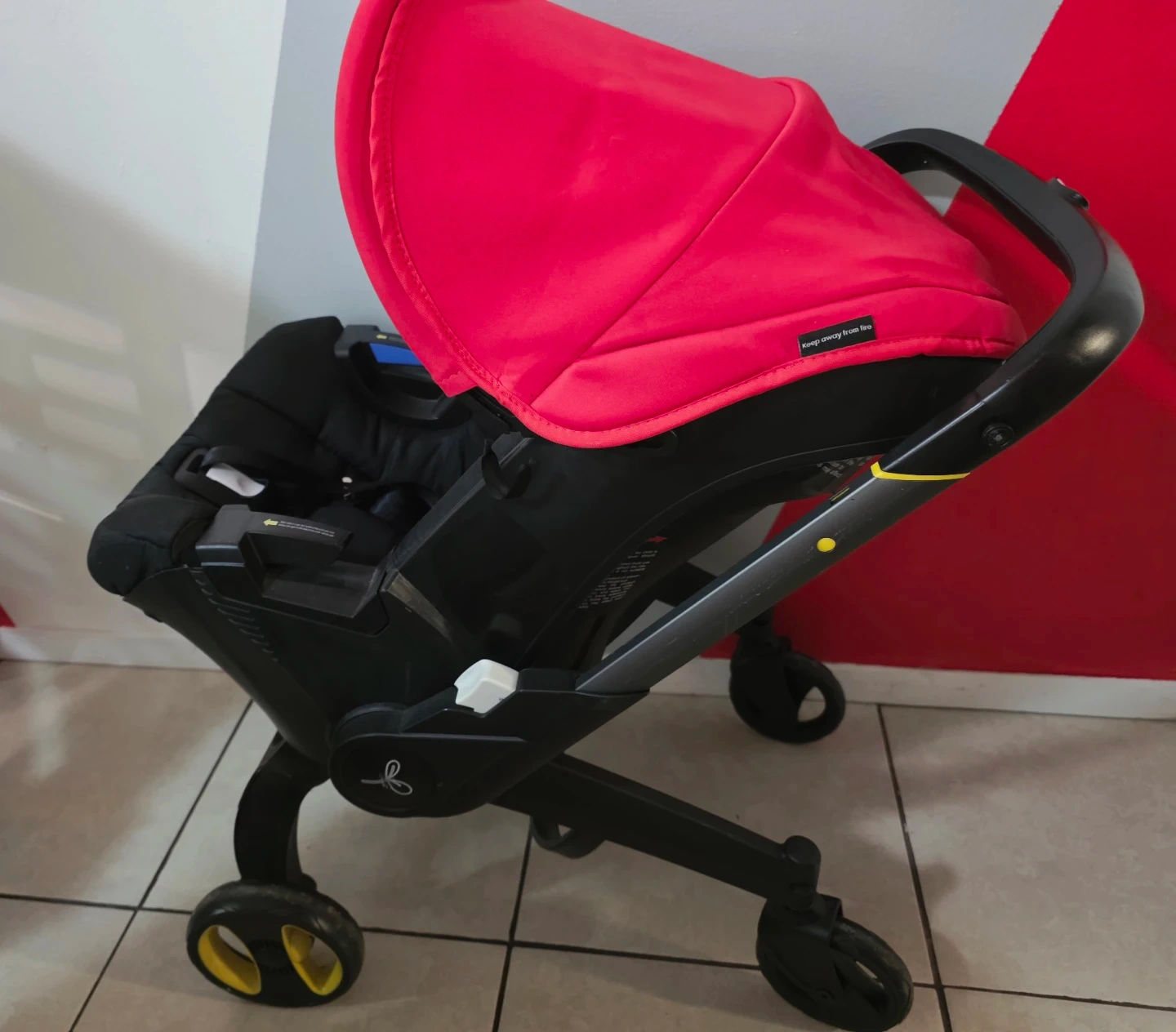 This is a black and red Doona infant car seat and stroller. It's designed for easy travel and convenience for parents on the go. Includes harness.