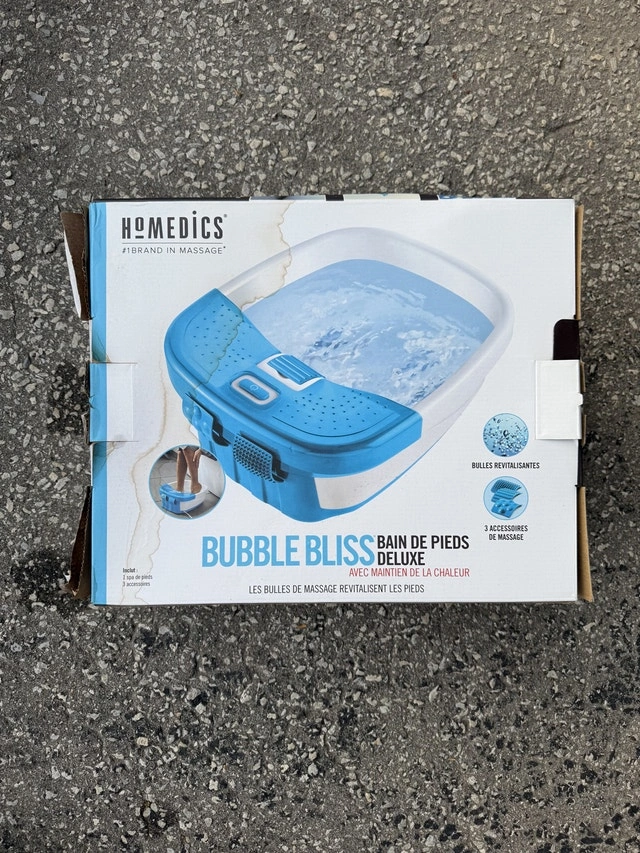 Indulge your feet with the Homedics Bubble Bliss Deluxe Foot Spa, complete with heat and massage features for ultimate relaxation. This foot spa is like new, including two massage attachments, offering a soothing experience right at home. Brand: Homedics Model: Bubble Bliss Deluxe Features: Heat, massage, bubble function Condition: Like new, in original packaging. Imagine sinking your tired feet into this spa after a long day—it’s like a mini-vacation! If the ad is up, it's still available. Cash accepted.
