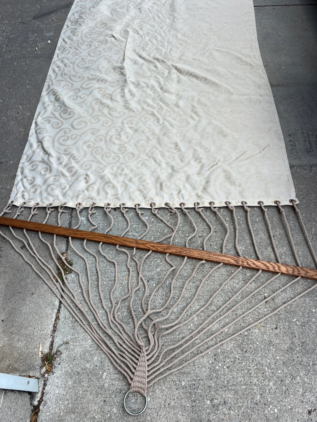 Selling a hammock featuring a beige patterned fabric. It has wooden supports and rope detailing. Great for relaxing outdoors! No posts