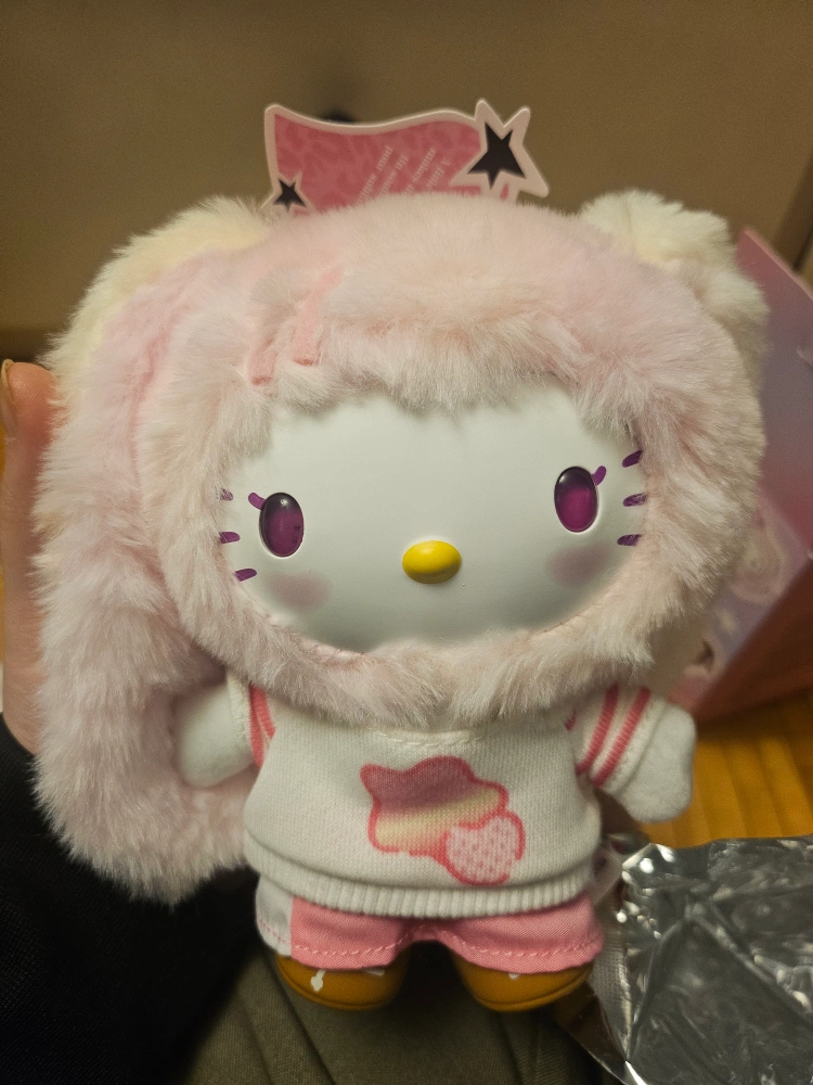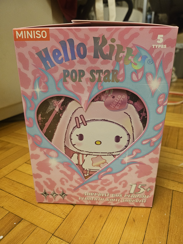 This is a MINISO Hello Kitty Pop Star surprise blind box. It's a collectible item featuring cute Hello Kitty characters in a pop star theme. What character you get is a fun surprise!