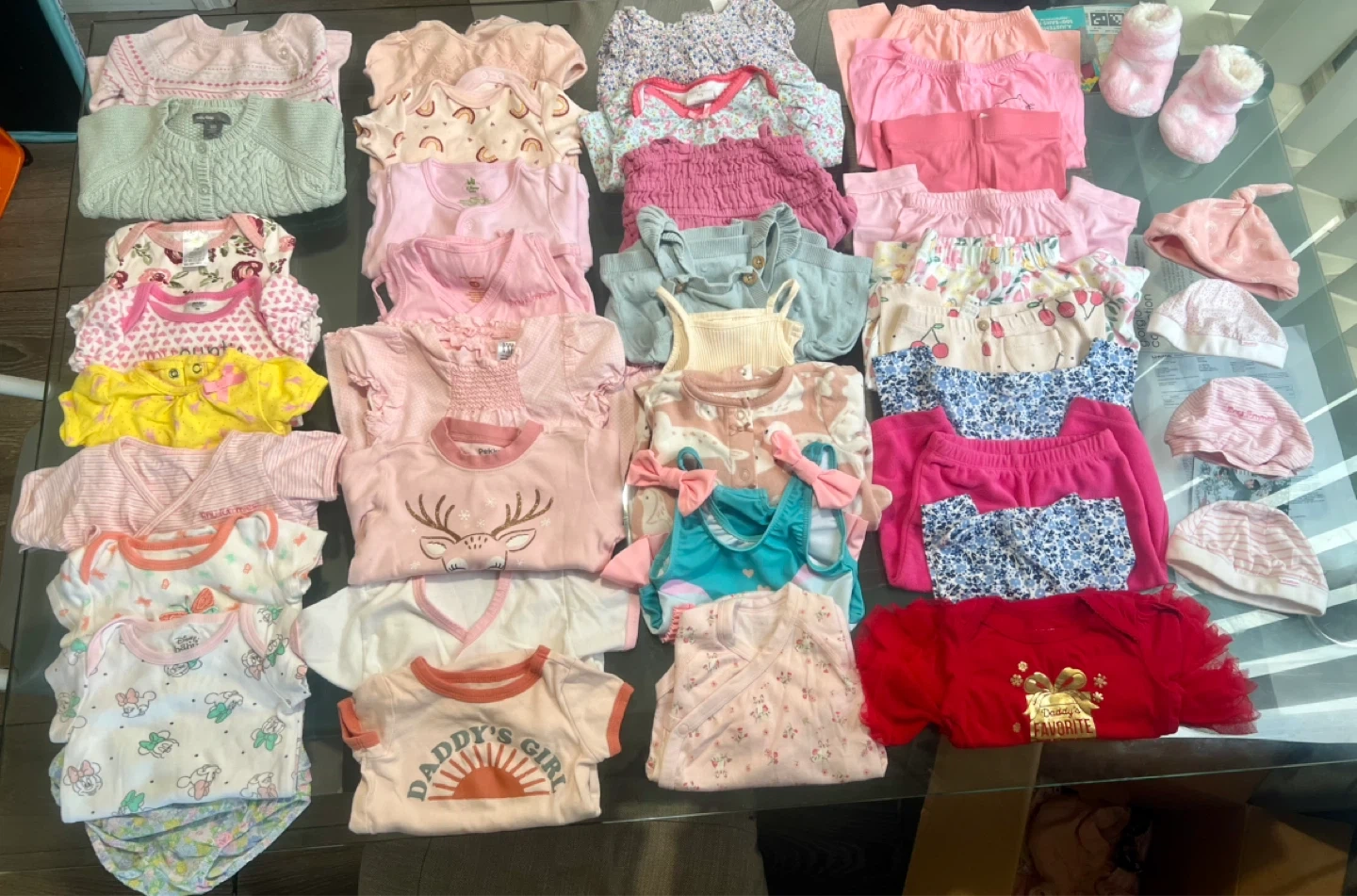 This is a bundle of baby girl clothing items 40pcs. Includes various onesies, pants, swimsuit, dress, tops, pink boots and beanies. Mostly pink and floral patterns.