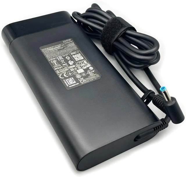 Genuine 200W AC adapter for HP laptops (HP part number L00895-003), providing a 19.5V, 10.3A output with a 4.5mm x 3.0mm barrel connector with a central pin. Commonly used with HP Omen, Pavilion Gaming, and ZBook series laptops. Compatible with other HP adapters such as TPN-DA10 and L00818-850.