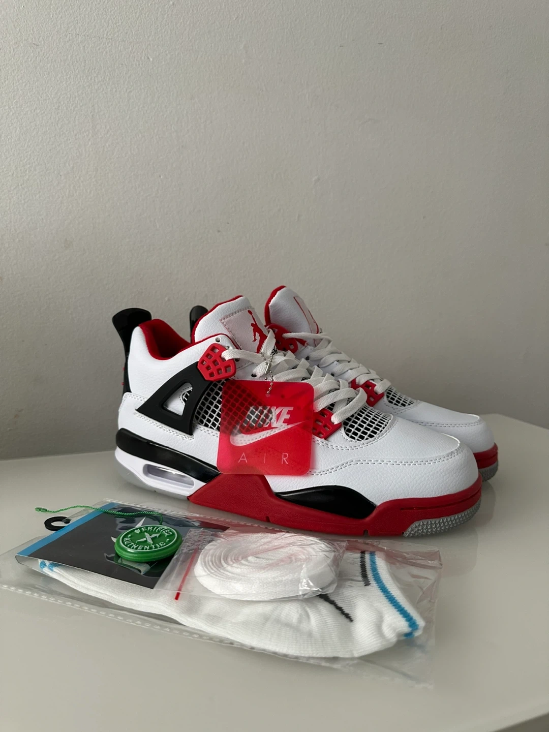 Up for grabs are a pair of Air Jordan 4 Retro White Red Black Men's Shoes. They feature a clean white base with red and black accents-perfect for sneakerheads or anyone looking for a stylish everyday shoe.