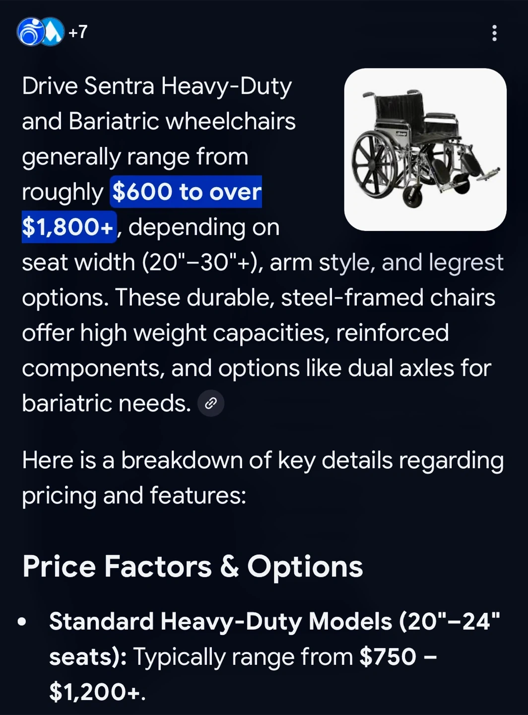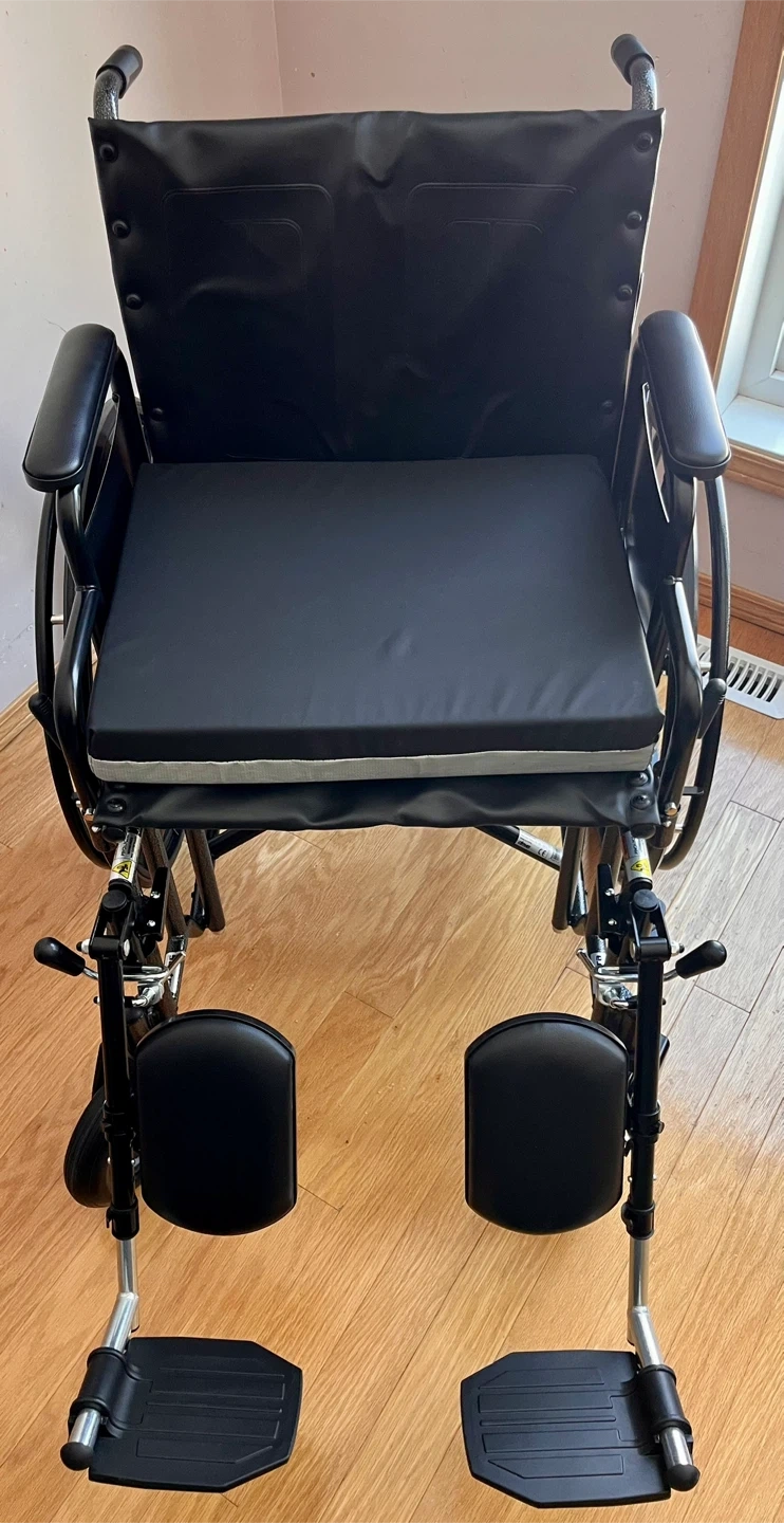 This is a New Drive Sentra heavy-duty wheelchair black. It features a durable black vinyl seat and backrest. The chair includes adjustable footrests for added comfort and support. It's designed for reliable mobility assistance. Big front wheels for outdoors, New seat cushion included, 500 lbs max weight 20” seat. $500 obo delivery available or you can pick up at my home.