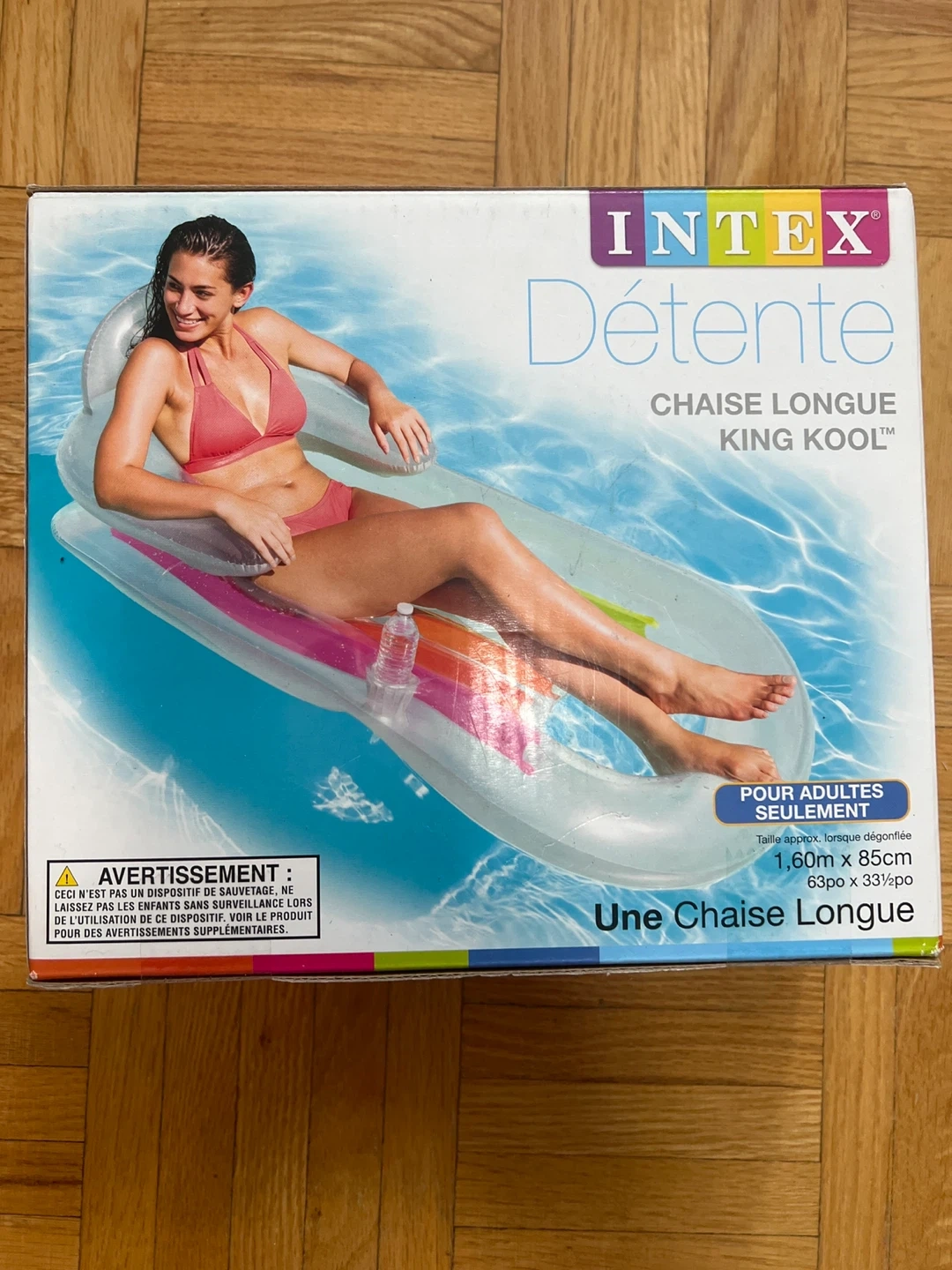 This is an INTEX King Kool chaise longue inflatable float. It measures approximately 1.60m x 85cm (63in x 33.5in) when deflated. This float is for adults only. It's great for relaxing by the pool!