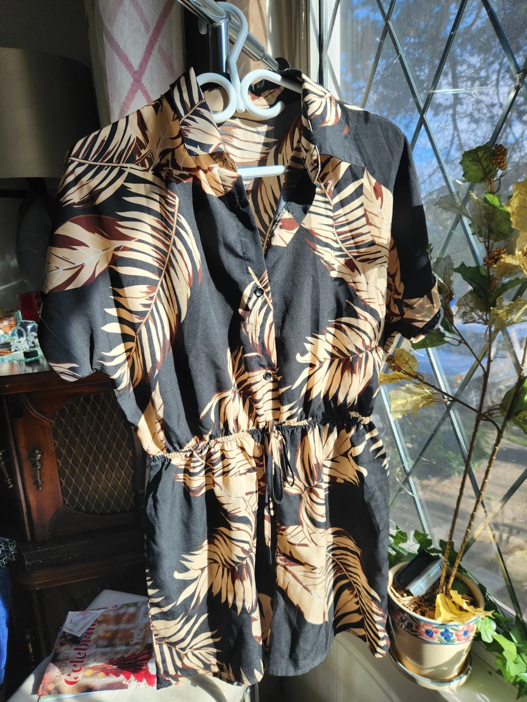 This short-sleeve romper features a black base with a bold tan and brown leaf print. It has a collared neckline and an elasticized waist with a drawstring. It's perfect for a casual summer day!