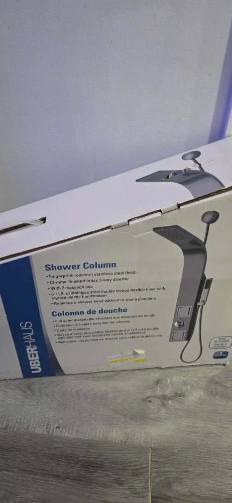60Selling a brand new Uberhaus shower column in its original box! It features a fingerprint-resistant stainless steel finish and a 2-way diverter. You'll also enjoy the 2 massage jets and a 5-foot stainless steel double-locked flexible hose with a square plastic hand shower. Plus, it has a pivoting shower head without re-doing the plumbing