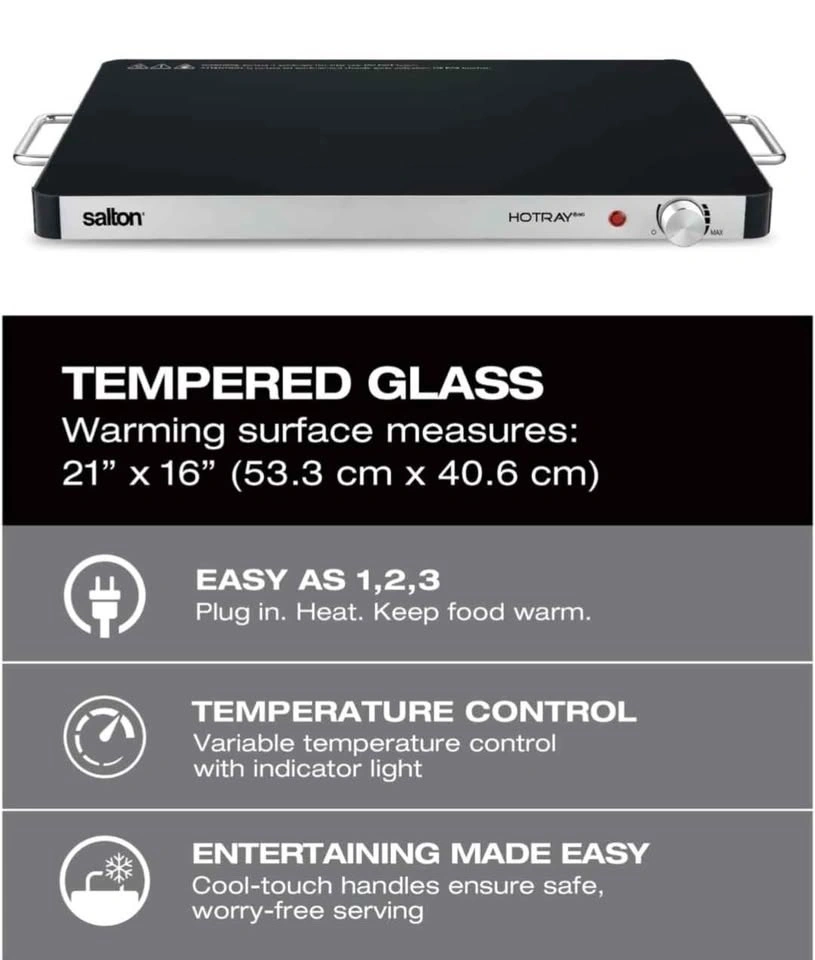 Perfect for hosting your big game gathering, the Salton Hotray XL’s large 21” x 16” tempered glass warming surface ensures all your appetizers, snacks, and main dishes stay warm and ready to serve throughout the event.