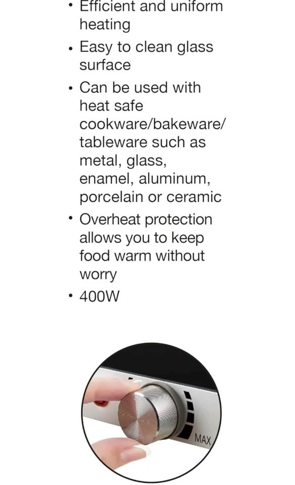 After the party, the smooth glass surface wipes clean in seconds letting you enjoy the celebration without any hassle of extensive cleanup. Powered by 400W for consistent and reliable heating.