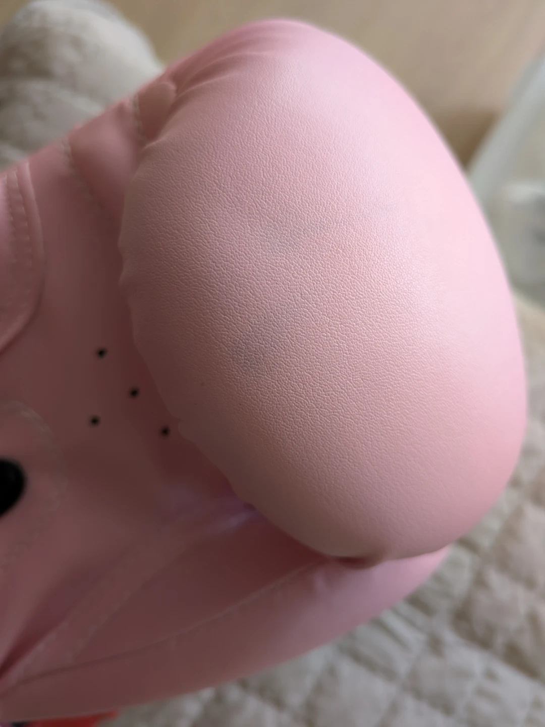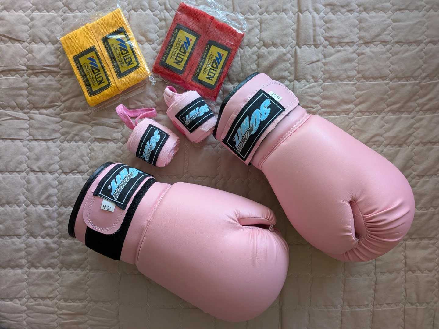 Pink boxing gloves, size 10oz. In great used condition - only used for at-home video workouts without bags, and even so very rarely used in the past couple of years. Some light imperceptible coloured stains I tried to capture on camera, likely from the bag I stored then in. There's a very small rip inside the left glove - I think when I tried to pull the velcro - but doesn't affect the function. Includes pink hand wraps (also used but cleaned) and two pairs of new yellow and red hand wraps. Perfect for training sessions!