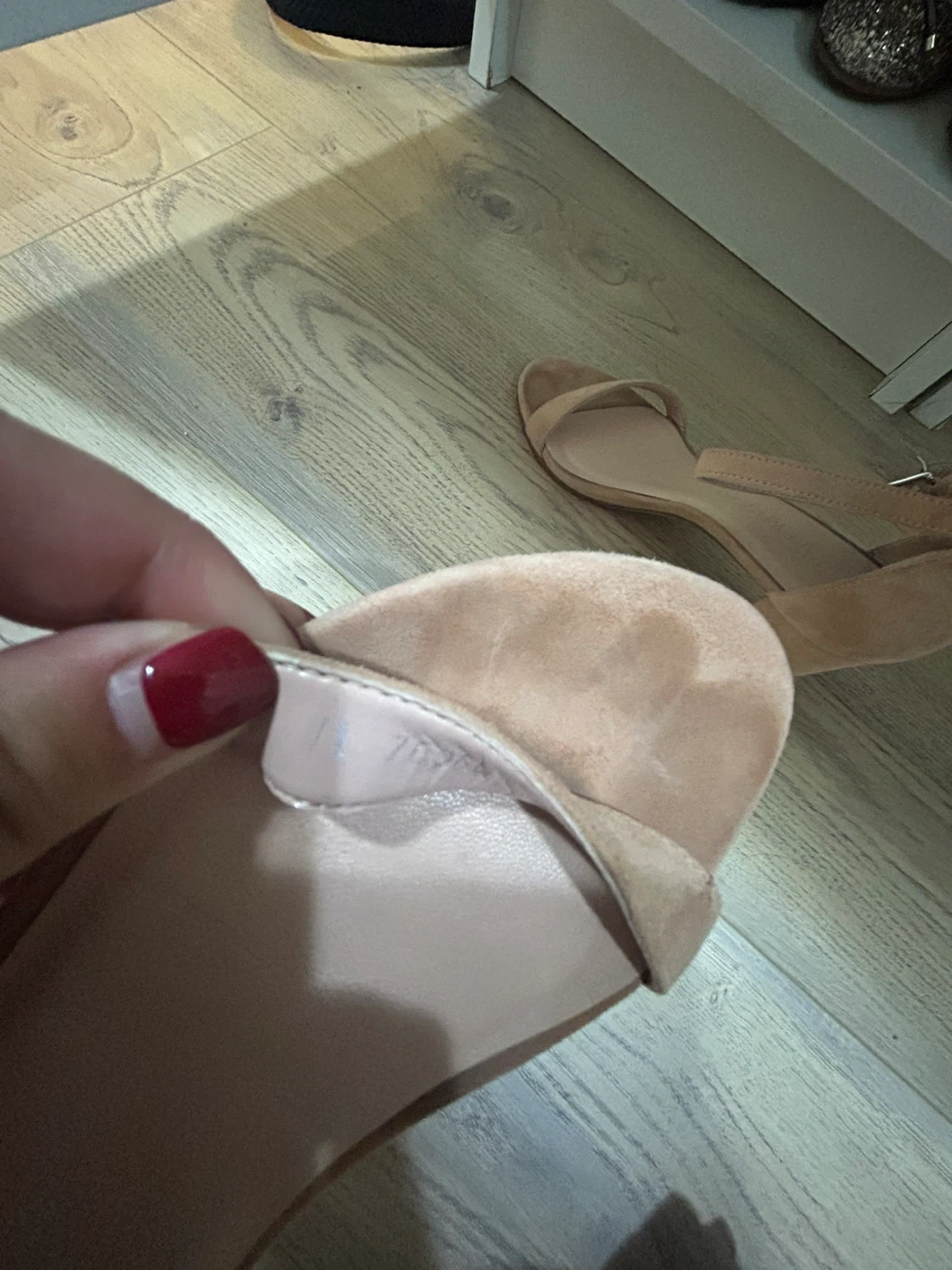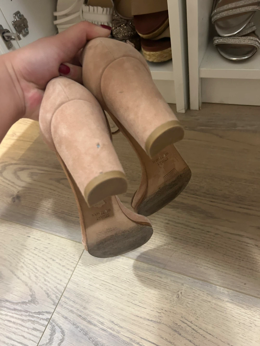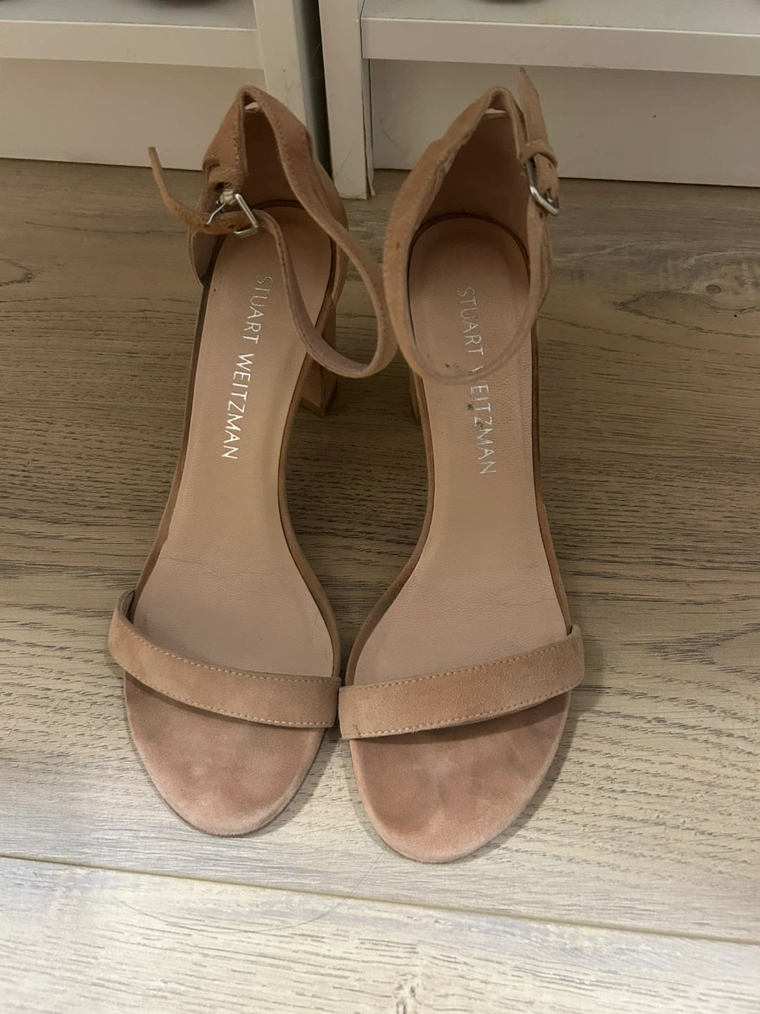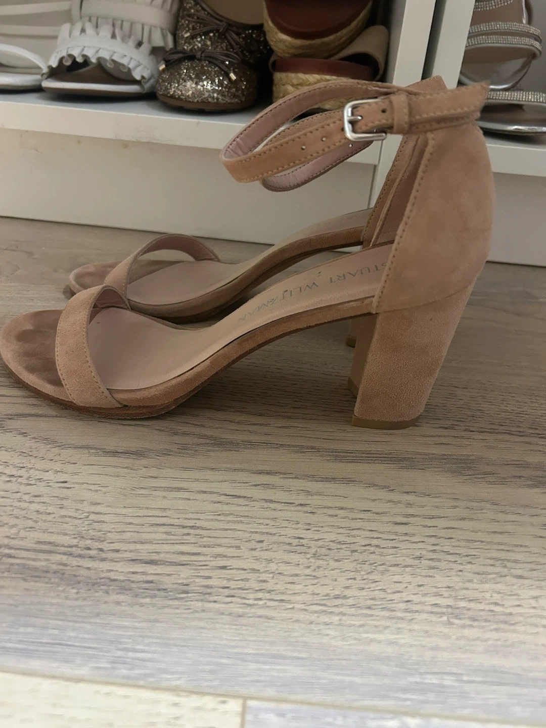 These are Stuart Weitzman nude suede block heels. They feature an adjustable ankle strap and a classic sandal design. Perfect for dressing up or down!