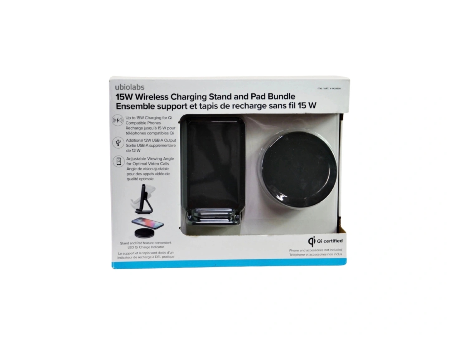 3615W wireless charging stand and pad. Up to 15W charging for Qi compatible phones. Additional 12W USB-A output. Adjustable viewing angle for optimal video calls. Convenient LED Qi charge indicator. Phone and accessories not included.