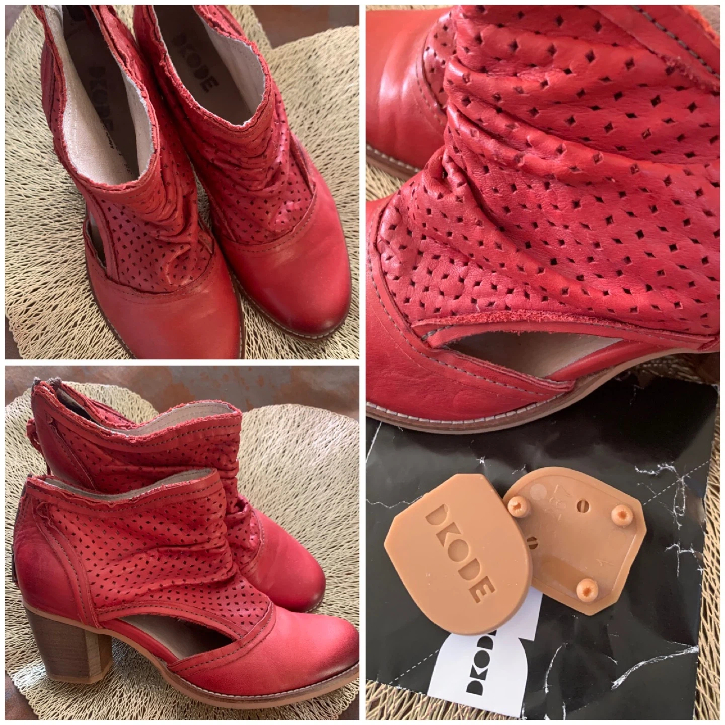 Stylish DKODE ankle boots in a vibrant red hue. Features a perforated design and a comfortable heel. Includes original replacement heel taps.