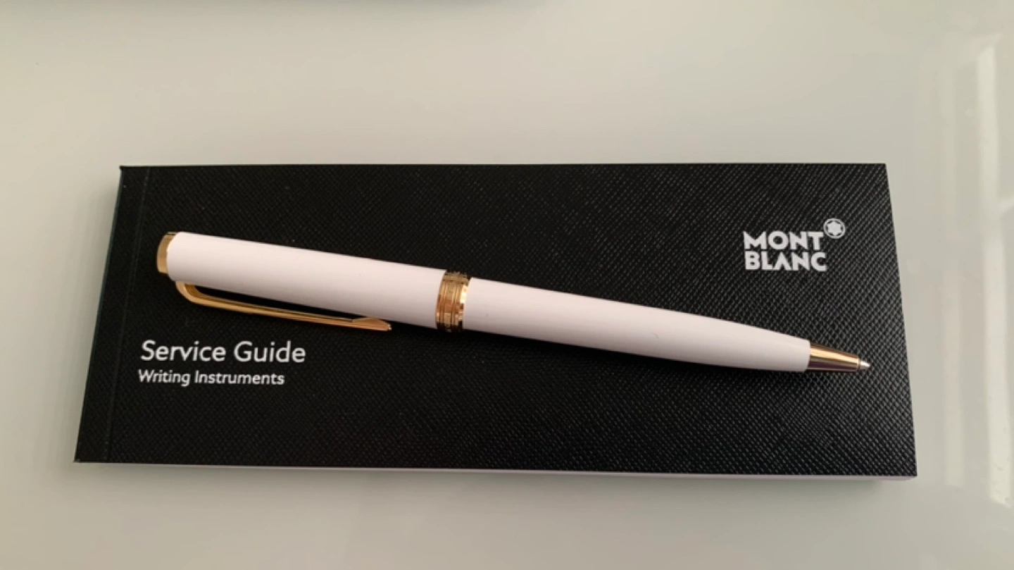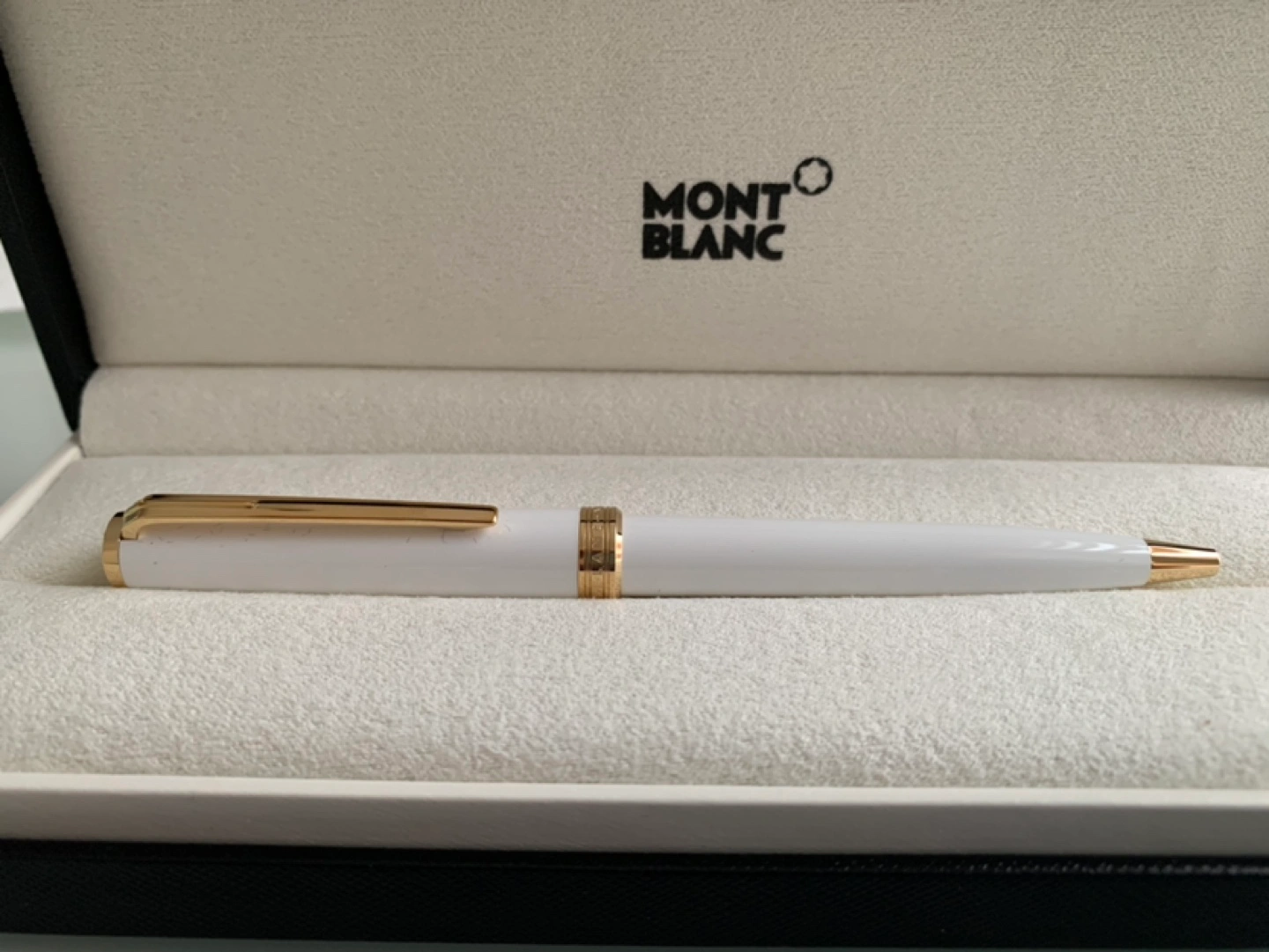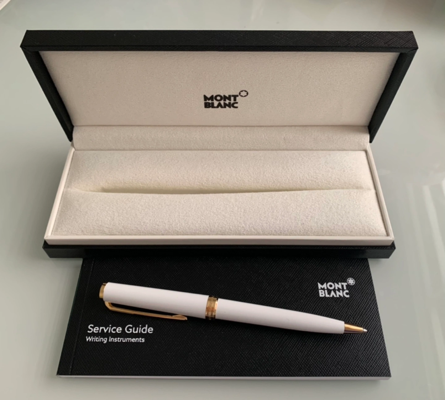 Brand New - White ballpoint pen in original box with service guide. Gold accents.