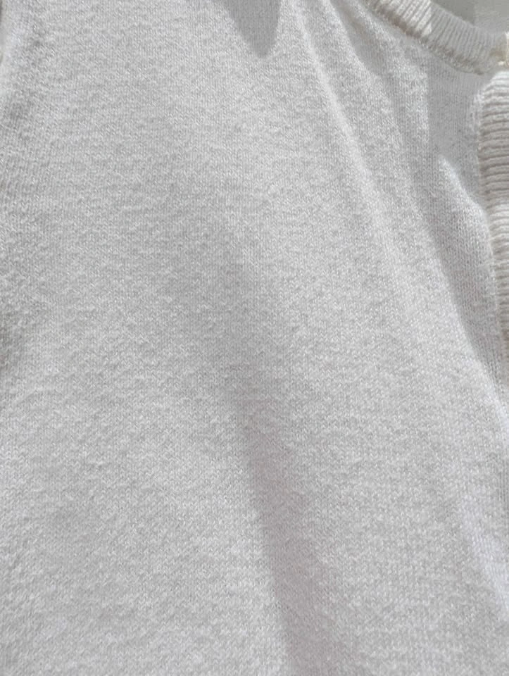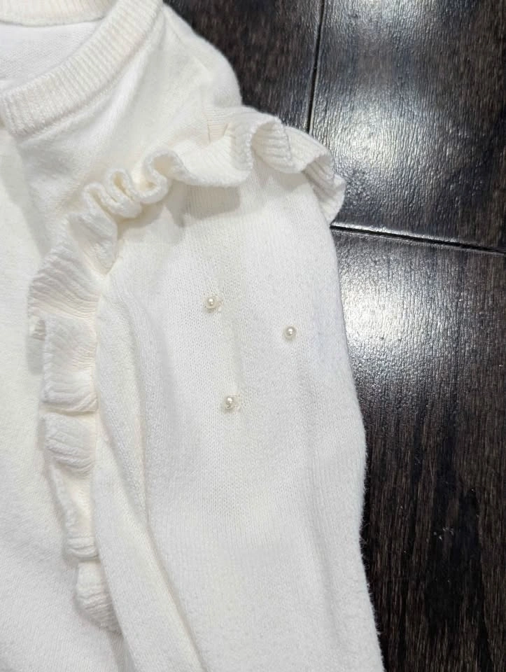 Soft cotton knit cardigan with ruffle trim on the shoulders and a button-down front. Features ribbed cuffs and hem plus a small pearl bead accent on the left sleeve. Perfect for school or everyday wear. Condition: Good, some pilling. Clean and smoke-free home. Love more than one item? Create a bundle and I’ll send you a special discount — the more items you add, the bigger the savings!