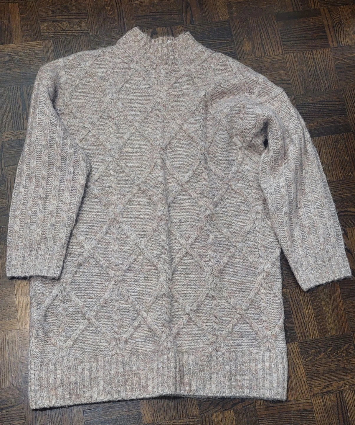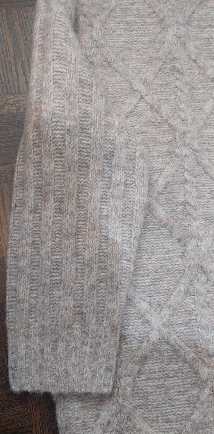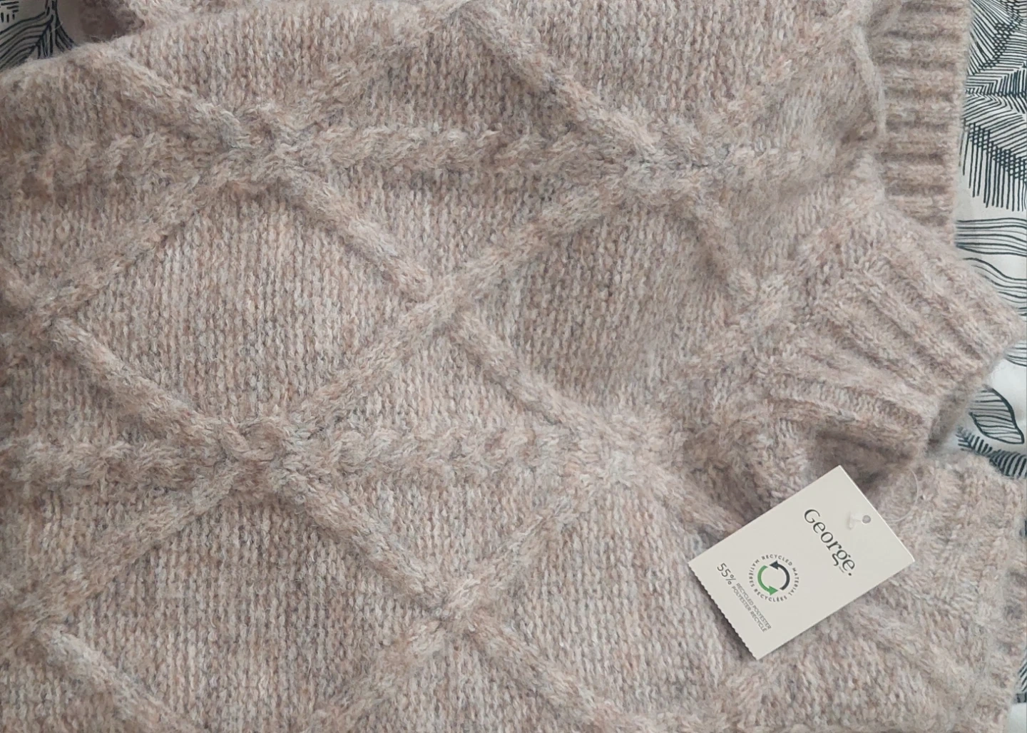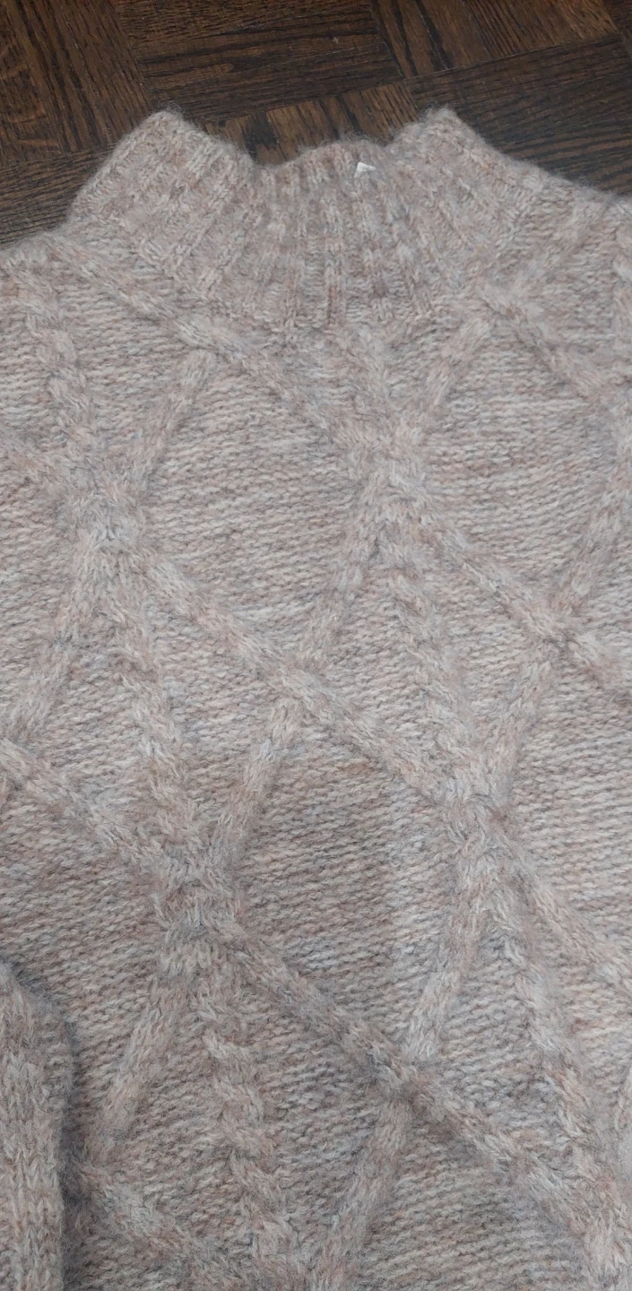 A cozy George women's sweater featuring a classic cable knit pattern. It's made with a blend of recycled polyester and acrylic. This sweater has a mock neck and long sleeves, perfect for cooler weather.
