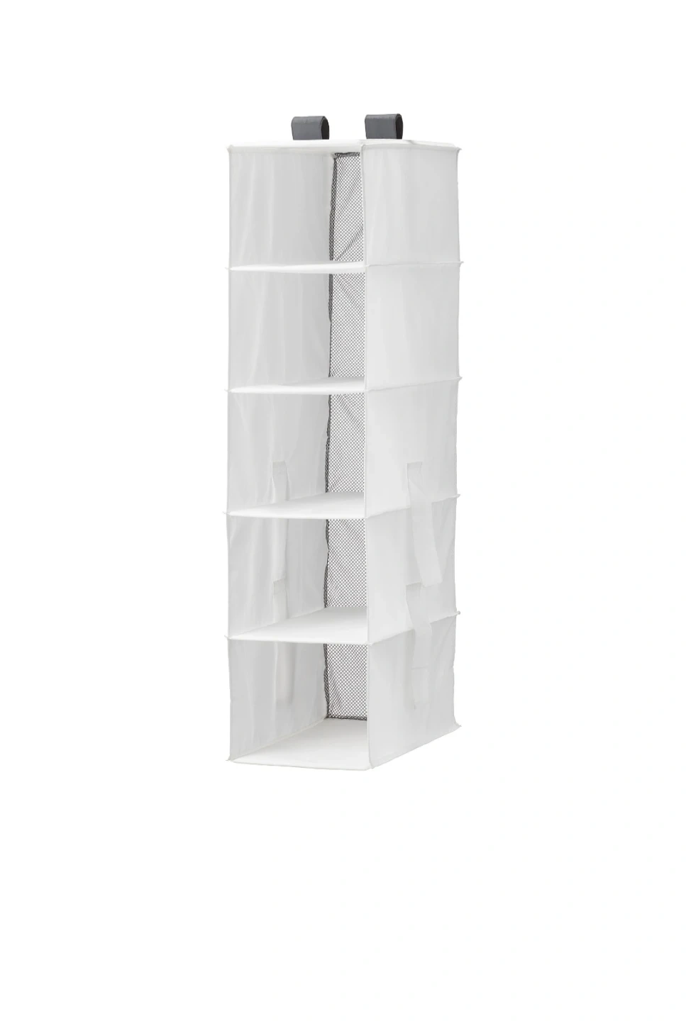 This hanging closet organizer features five spacious shelves for storing clothes and accessories. It's made from durable fabric with mesh sides for ventilation. Perfect for compartmentalizing your closet space!