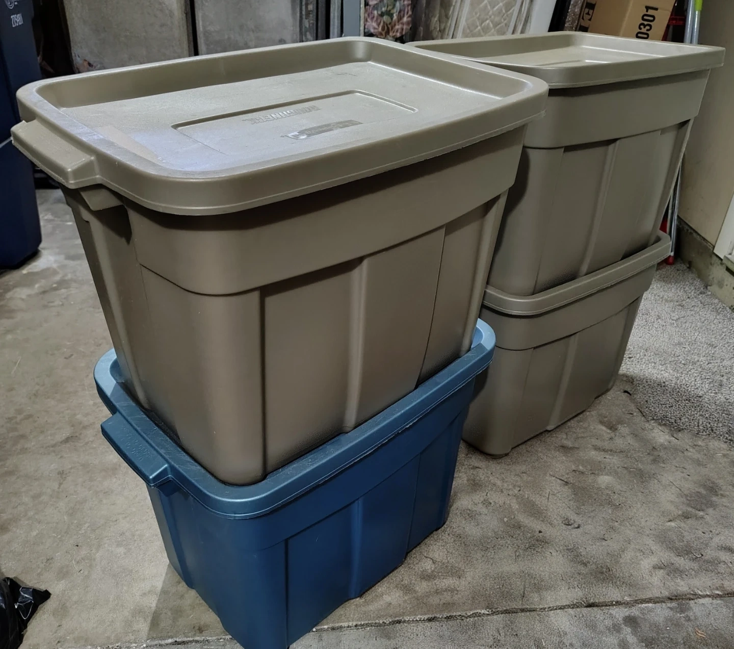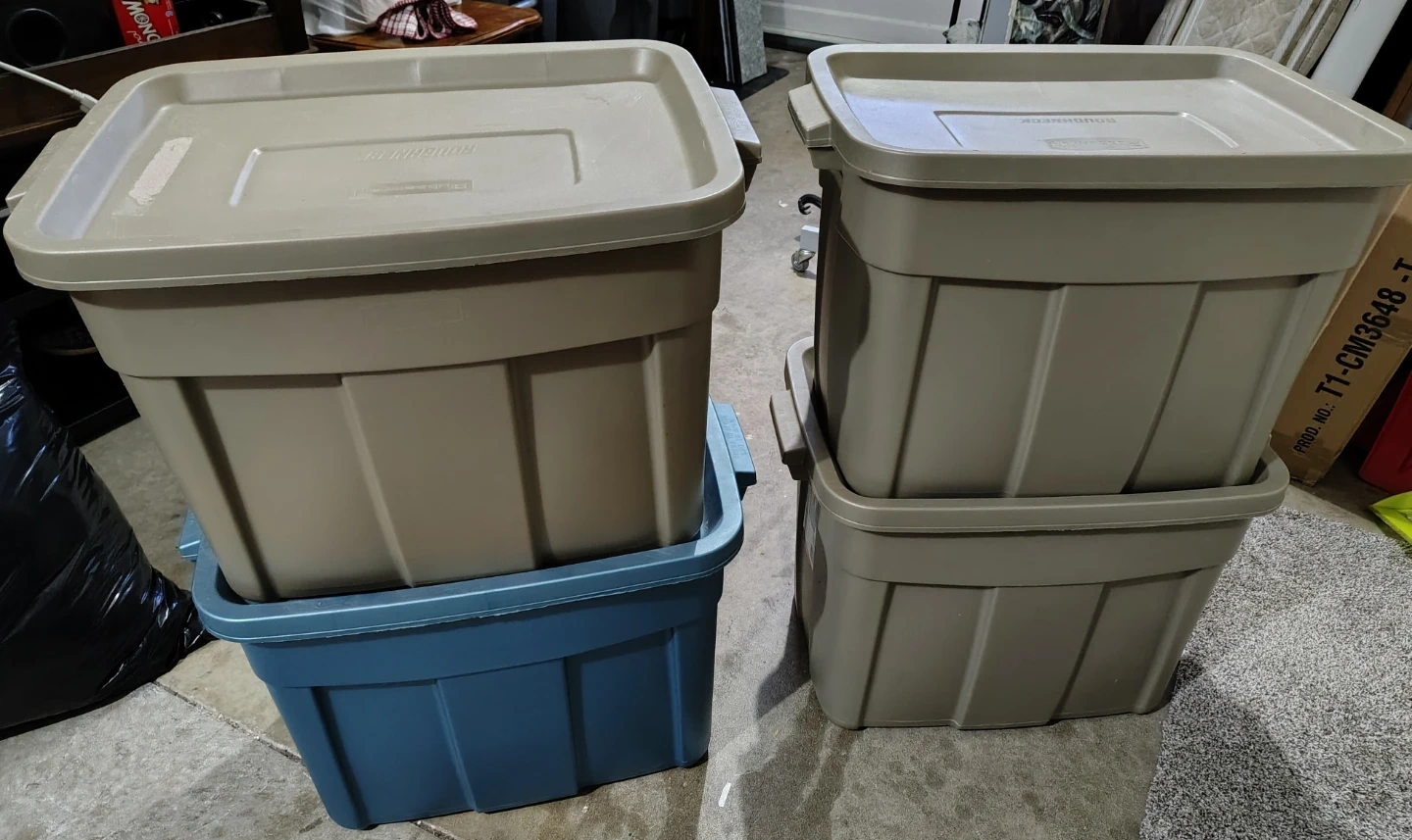 Set of four Rubbermaid storage totes. Includes one blue tote and three tan totes. Dimensions are 61 x 40 x 41.9 cm (24 x 16 x 16.5 in). Super tough design ideal for indoor and outdoor use. Let me know if you are interested. $15 Each.