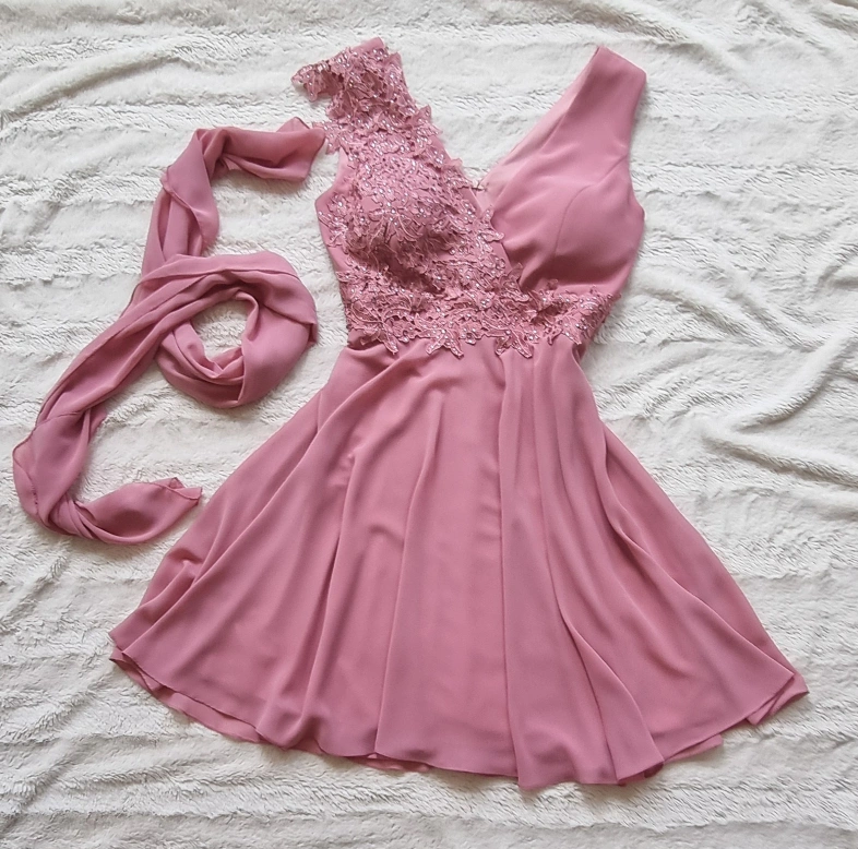 Beautiful pink dress with lace detail is looking for a new, lovely owner! Comes with matching pink chiffon shawl.