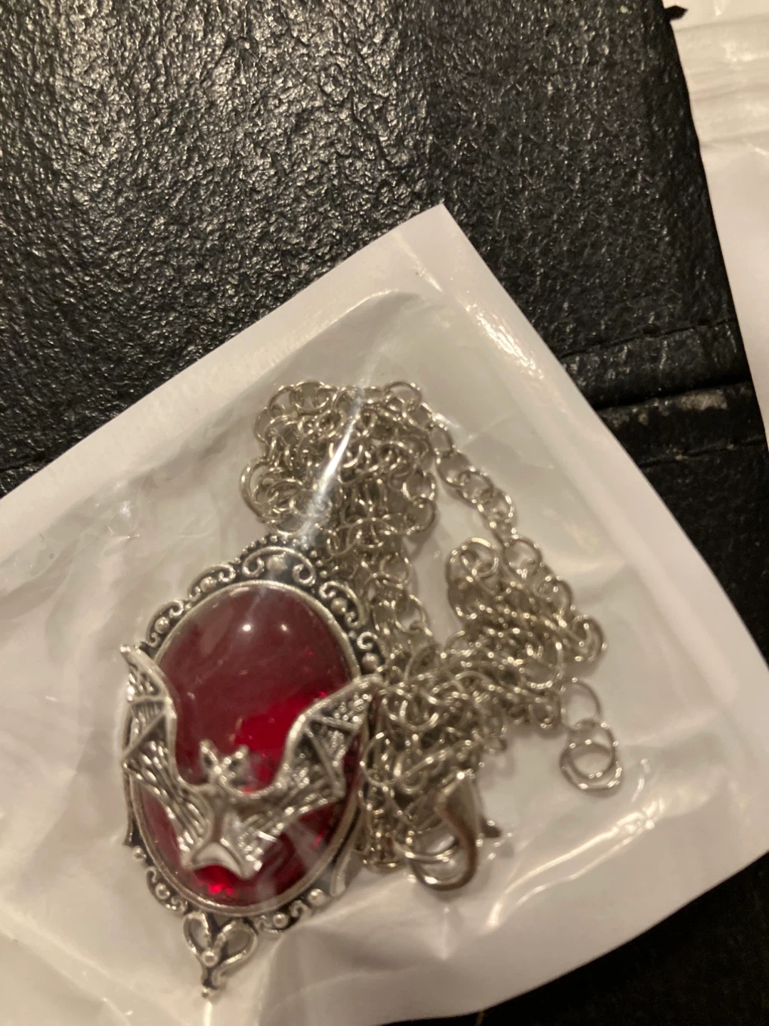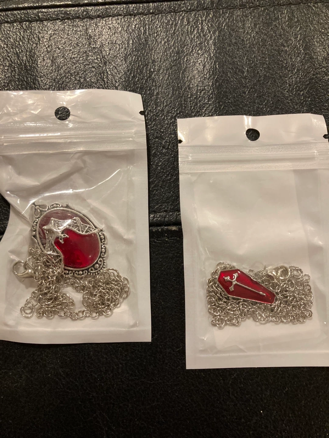 Two gothic-style necklaces, one featuring a red oval pendant with a bat design and the other a red coffin pendant. Both come with silver-tone chains. Perfect for adding a touch of dark style!