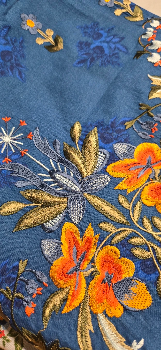 A beautiful blue kurti and pants set with intricate floral embroidery in orange, gold, and white. The kurti features detailed embellishments on the neckline and hem. Pants have a subtle floral print. This set is perfect for festive occasions or casual wear.