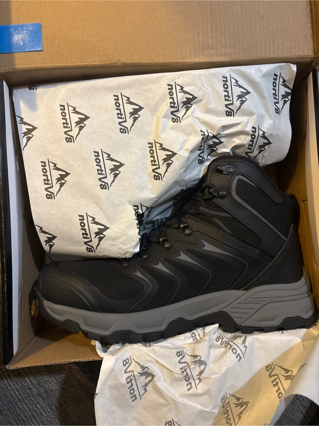 Selling a pair of nortiv8 men's hiking boots in black/grey, size US 9. These are waterproof and great for hiking or outdoor activities. They come in the original box!