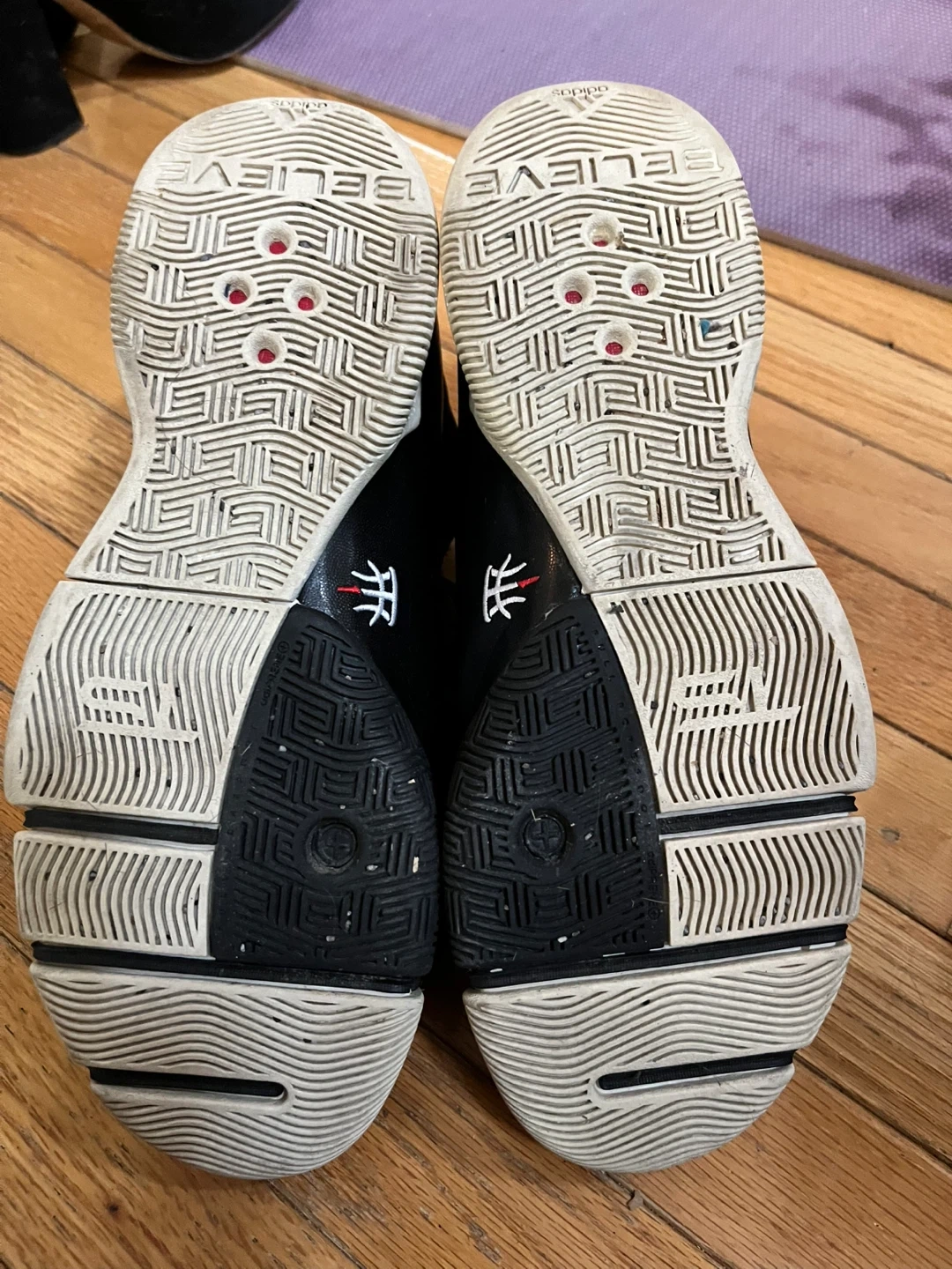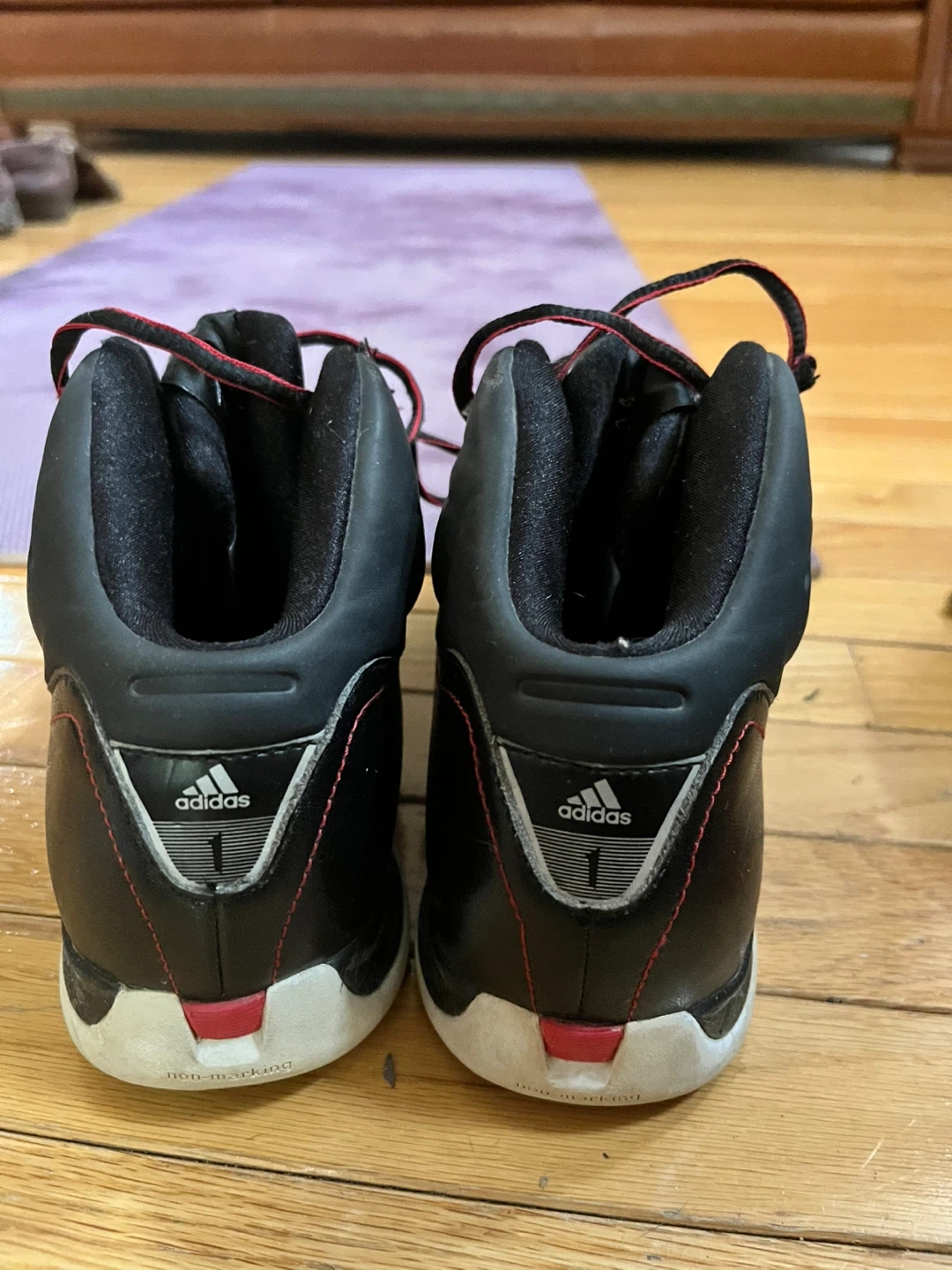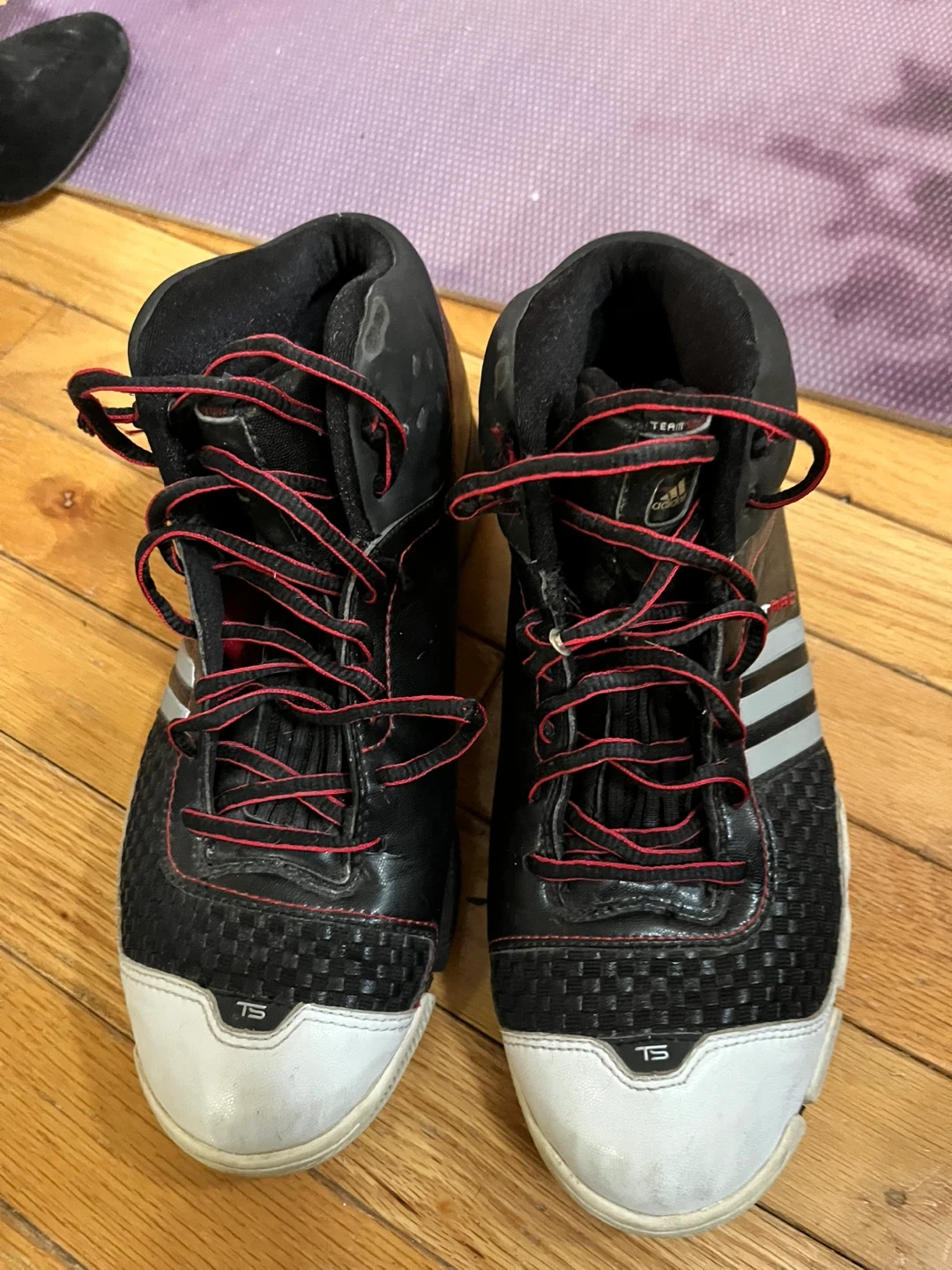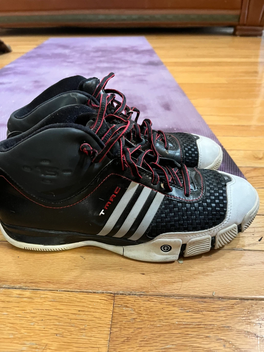 These are Adidas T-Mac basketball shoes in black and red. They feature a mid-top design for ankle support. The soles have a unique tread pattern for traction. Great for playing basketball!
