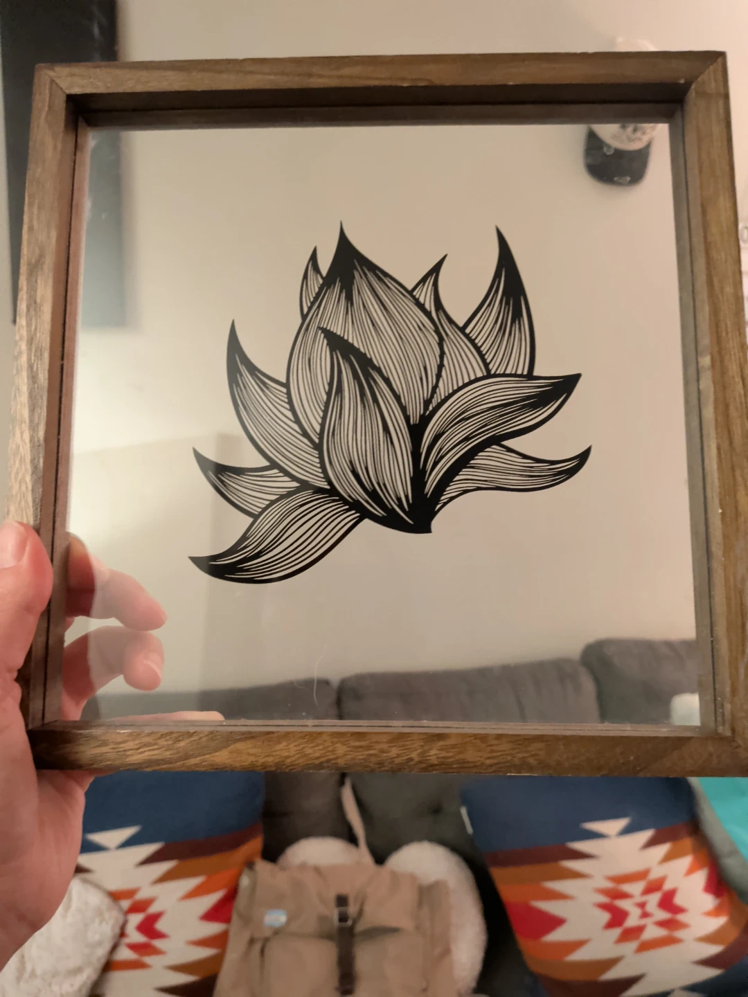 Wooden framed glass art featuring a black and white line drawing of a lotus flower. The frame is made of wood with a natural finish. It's perfect for adding a touch of minimalist decor to any room. It measures approximately 8x8 inches.