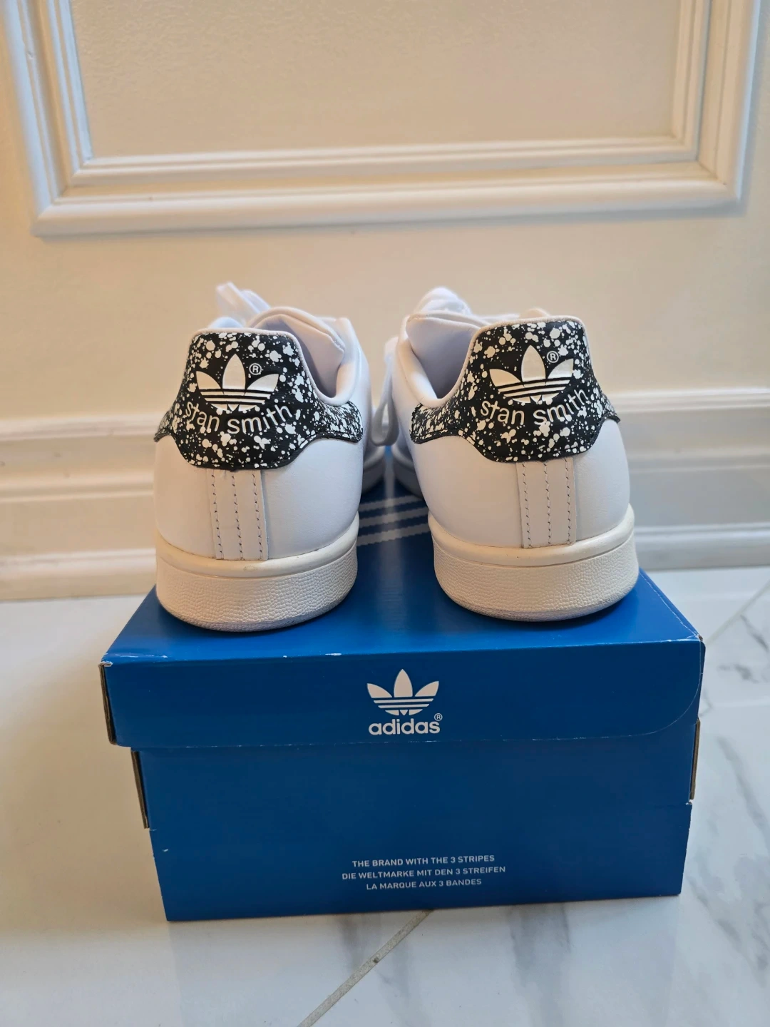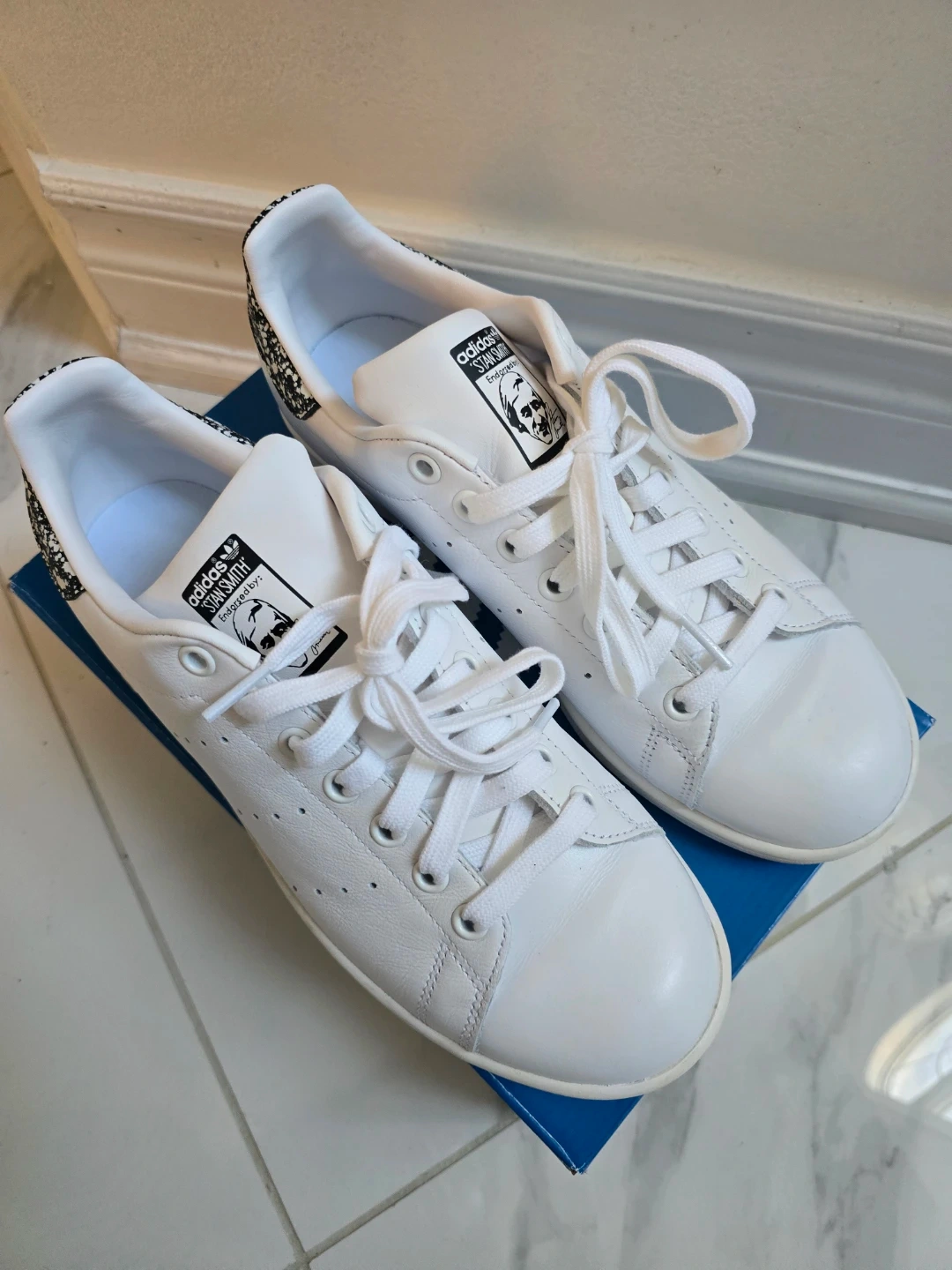 Classic white Adidas Stan Smith sneakers for women. Leather upper with signature perforated 3-Stripes detail. Includes original box. Women size 8 worn once, excellent condition