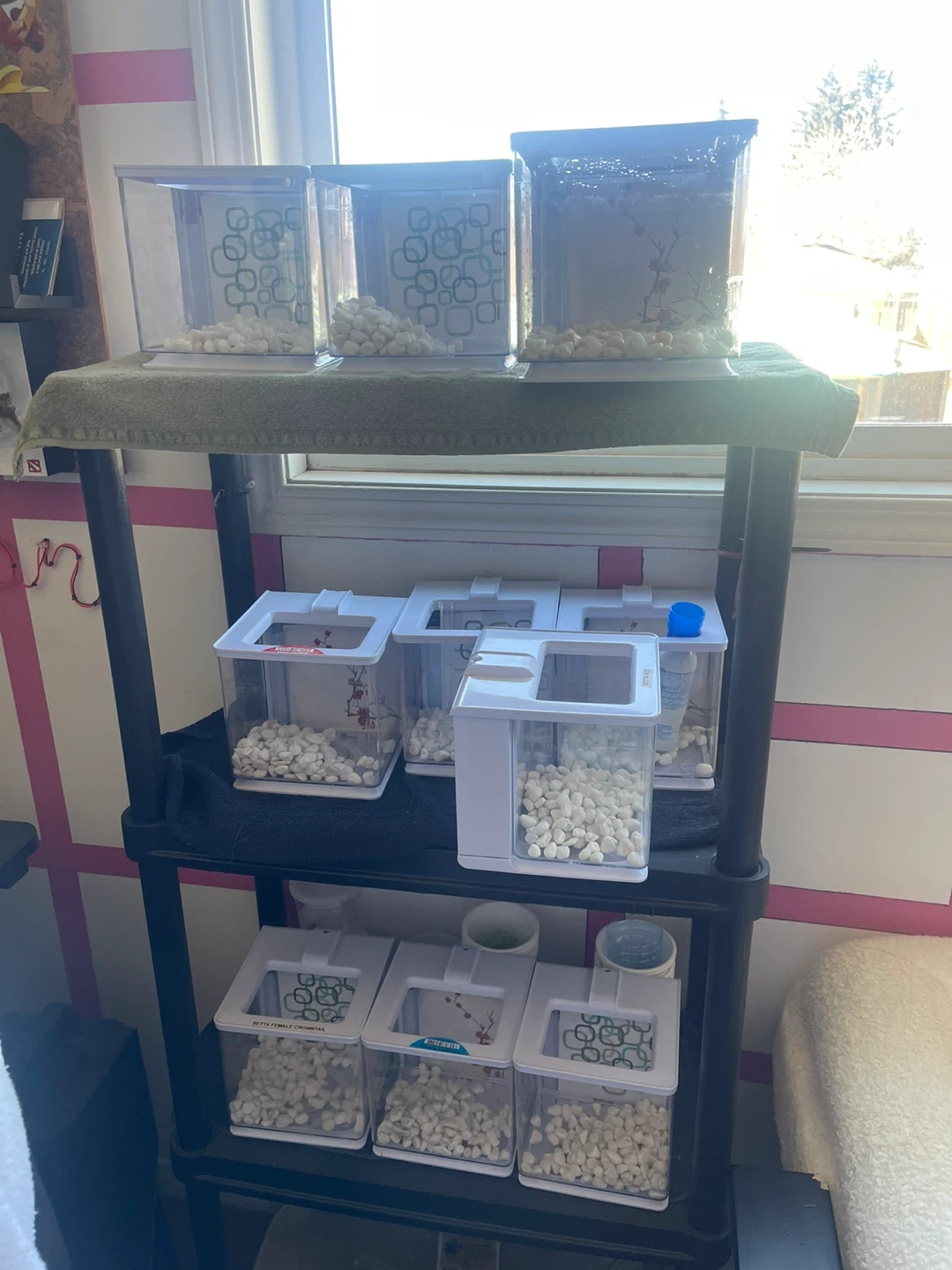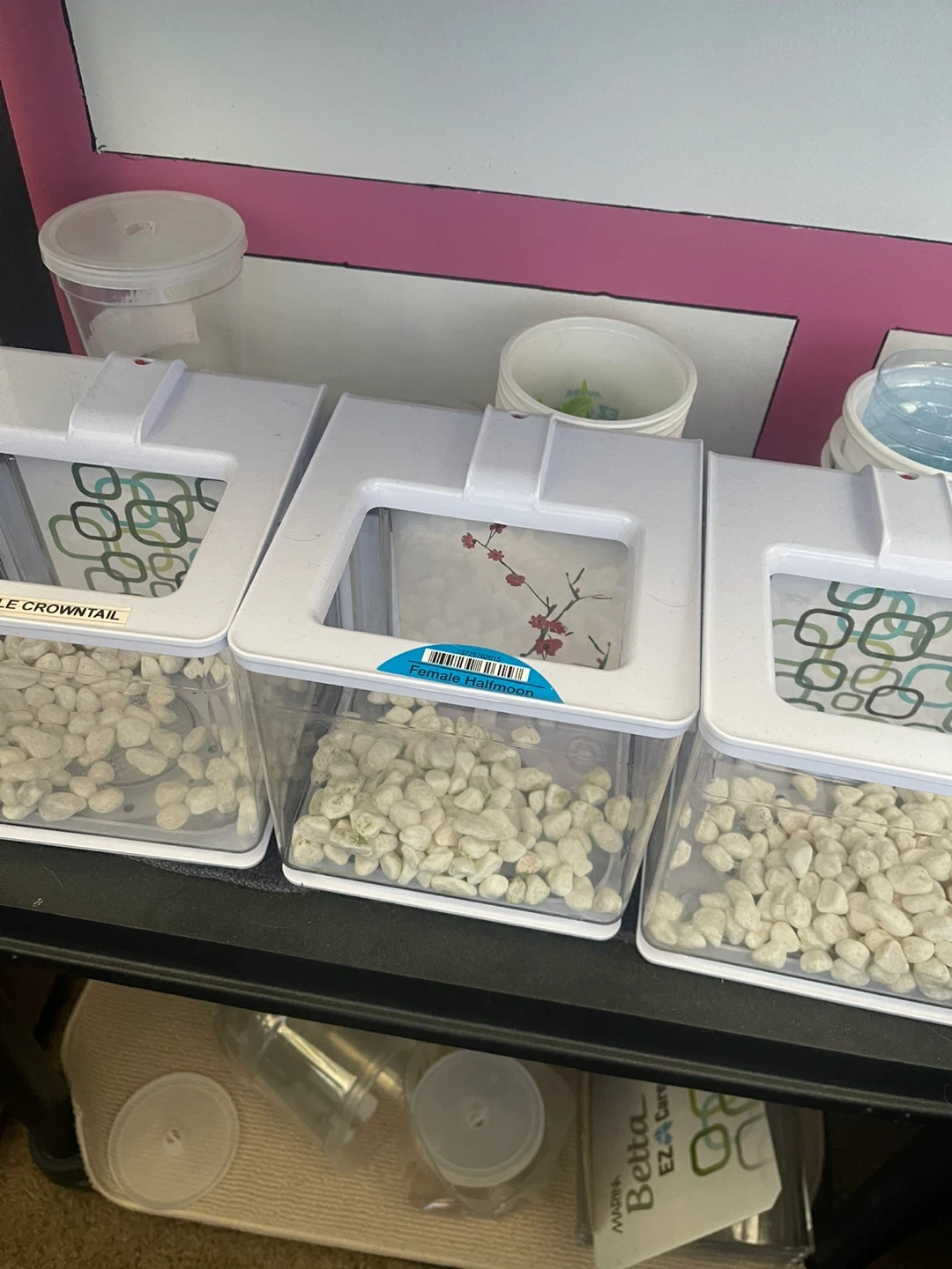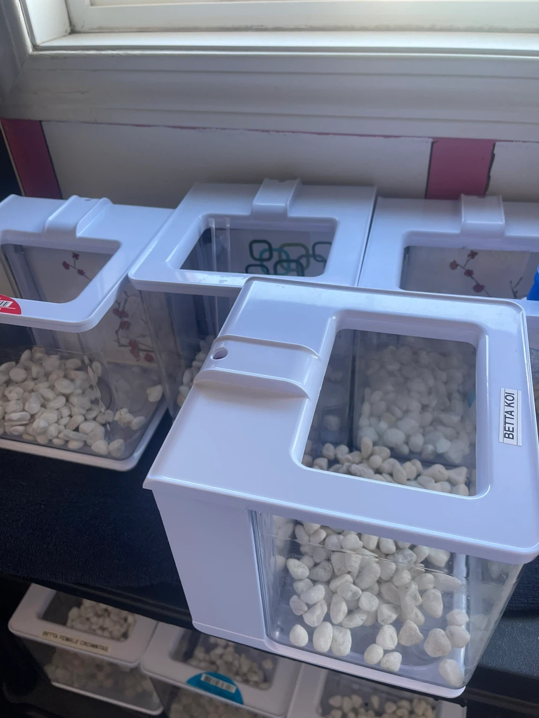 These are small betta fish tanks, perfect for individual fish. They're made of clear plastic with decorative inserts. Includes white gravel.